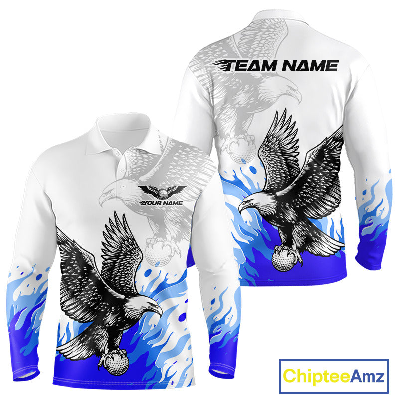 Mens Long Sleeve Golf Polo Shirt Custom Eagle Blue Flame Golf Tops, White Golf Outfit For Men NHN0070