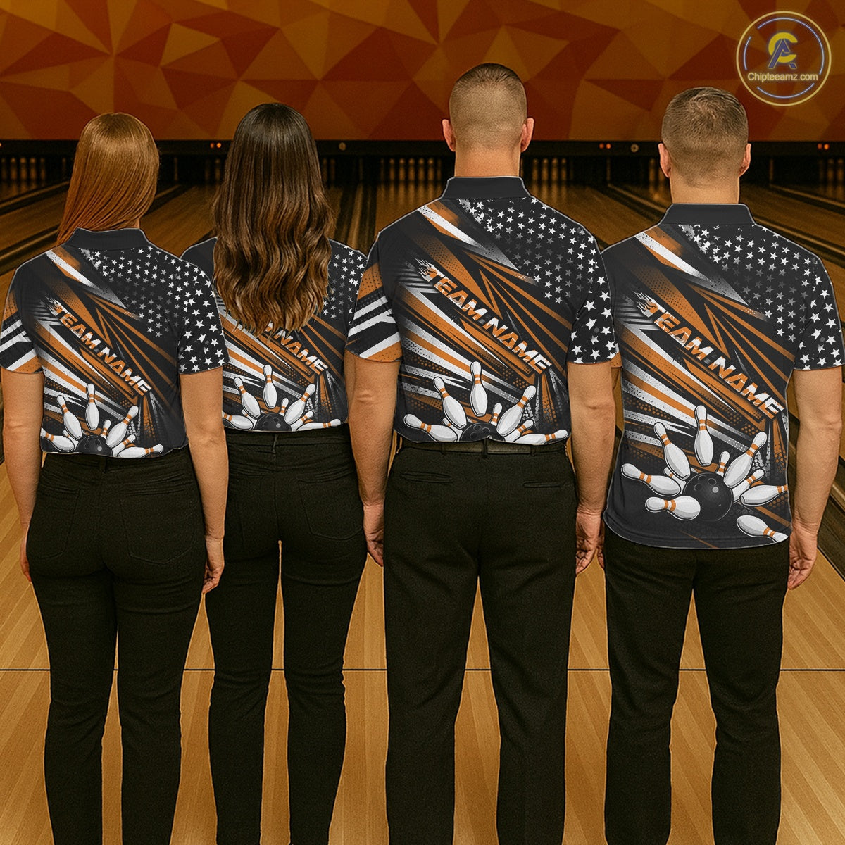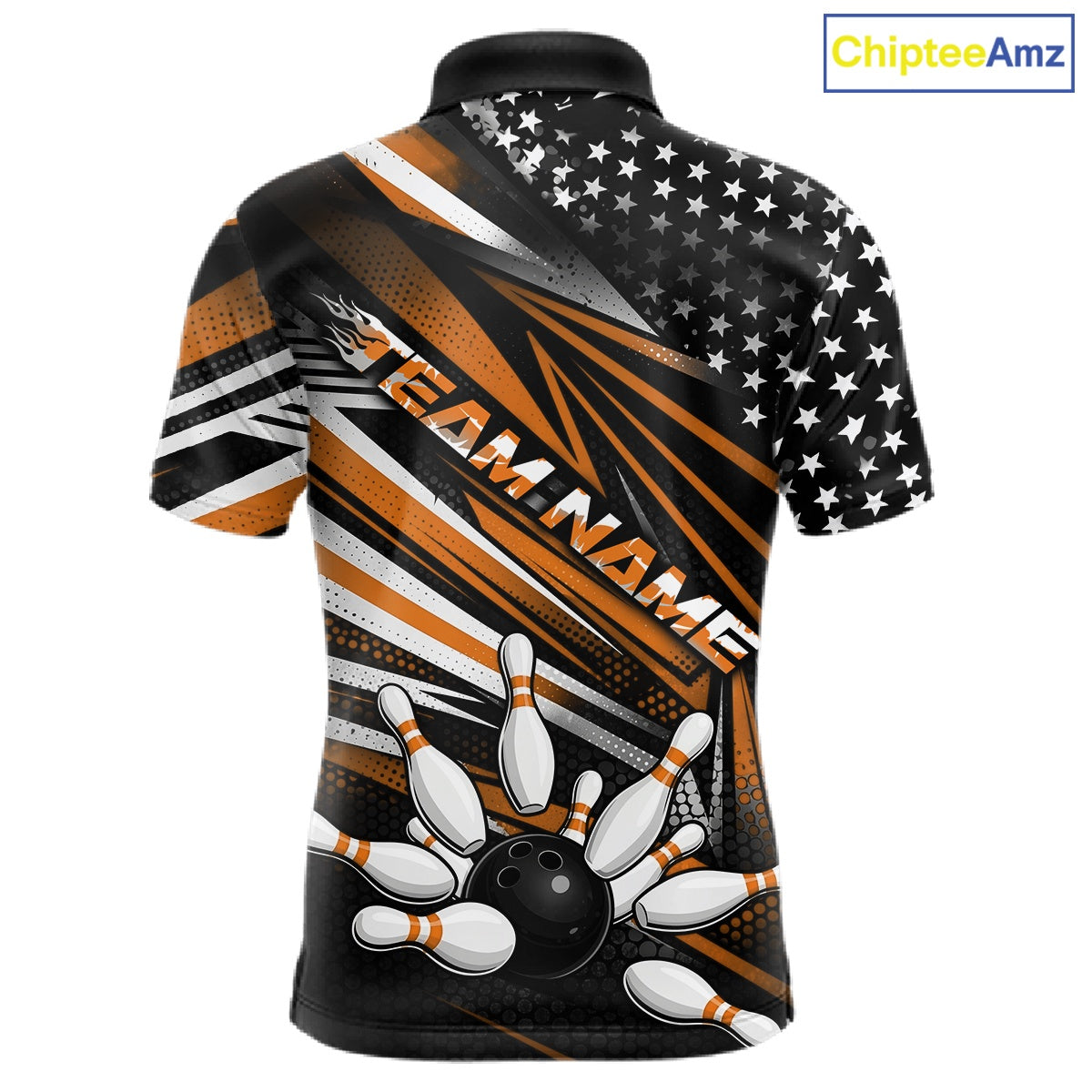 Custom Black And Orange US Flag Patriotic Strike Bowling Team Shirt, Freedom Bowling League Shirt Bowler Jersey IPHW10460