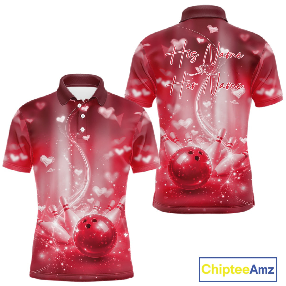Custom Red Valentine Bowling Couple Shirts, Red Heart Theme Bowling Jerseys With His Name And Her Name IPHW10475