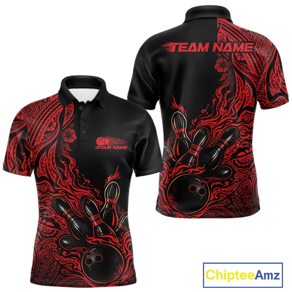 Custom Black And Red Orange Tribal Pattern Flame Bowling Team Shirts, Polynesian Bowling League Shirt IPHW10491