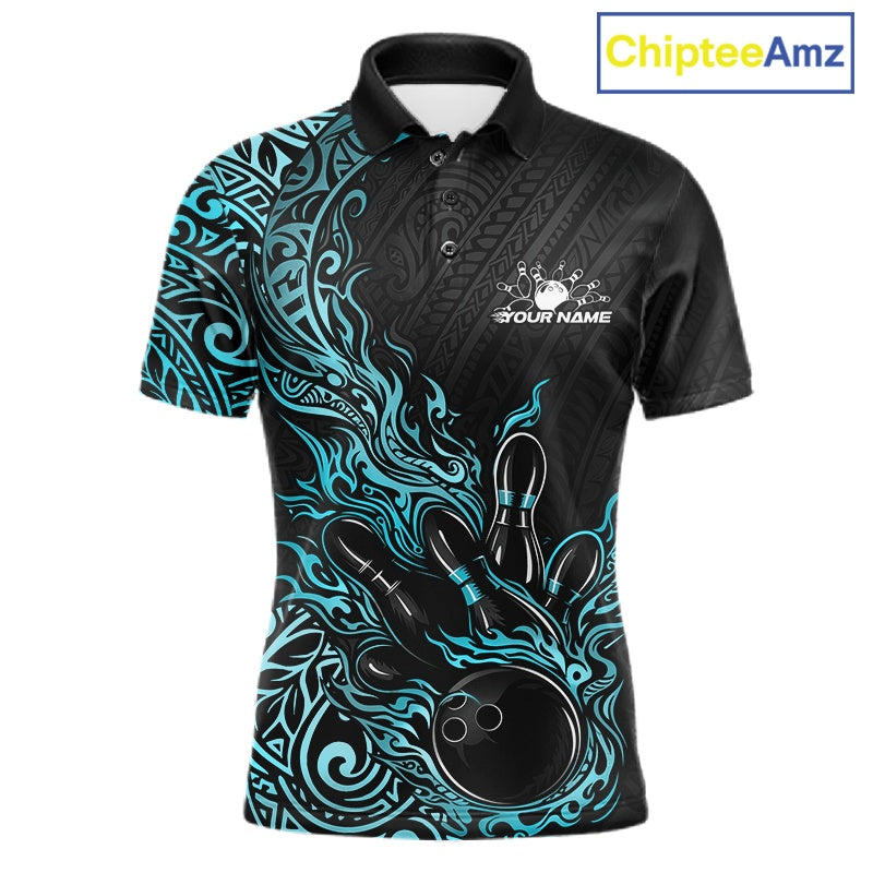 Custom Black And Blue Tribal Flame Bowling Ball Bowling Team Shirts, Polynesian Bowling Tournament Shirt IPHW10502