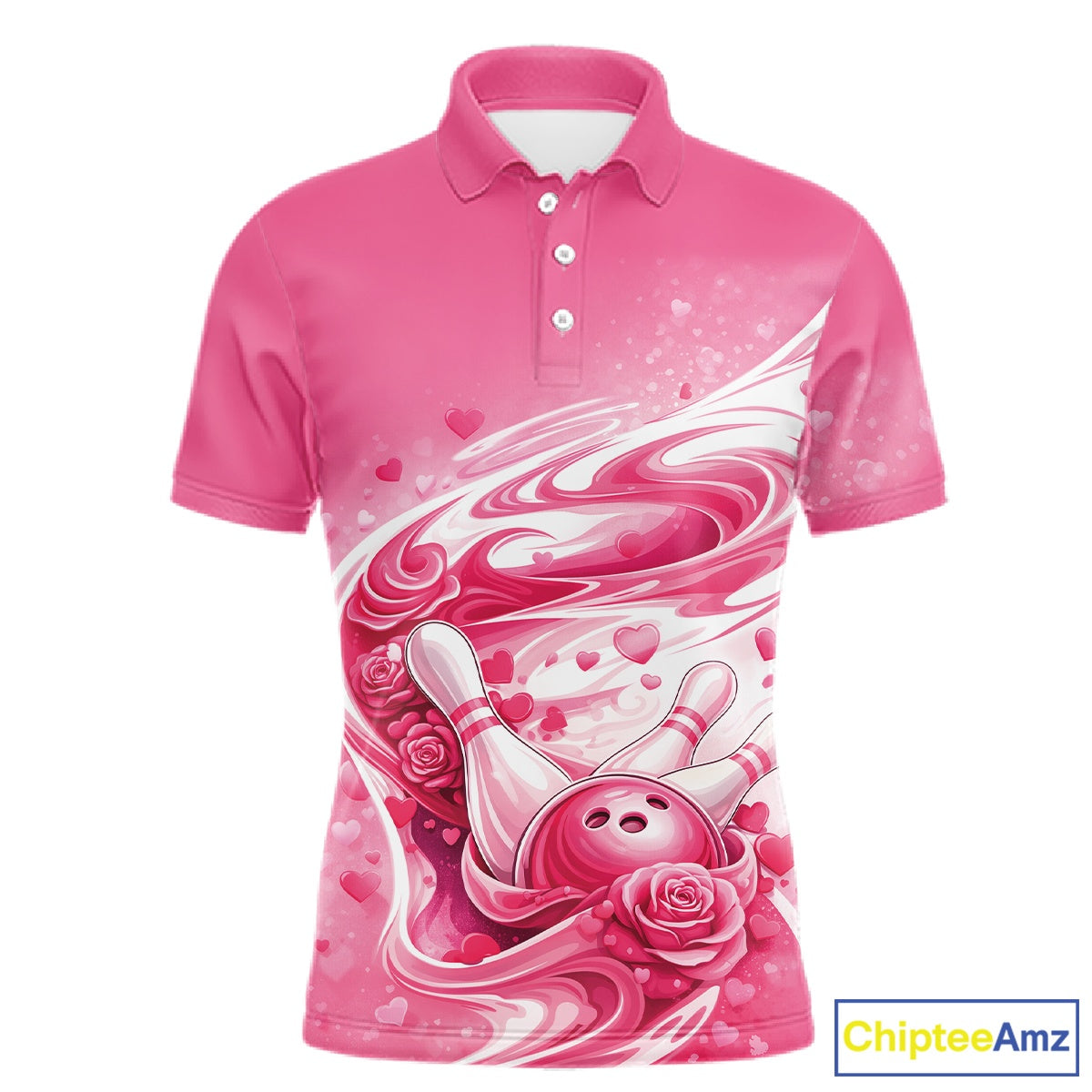 Custom Pink Heart Valentine Bowling Couples Shirt, Heart And Roses Bowling Husband And Wife Gifts With Name IPHW10518