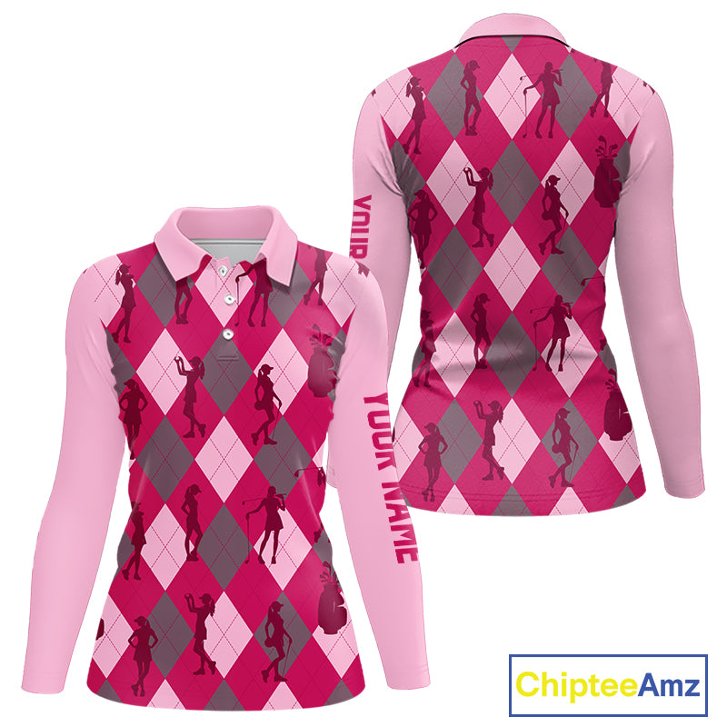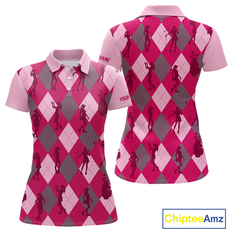 Pink Argyle Womens Golf Polo Shirts, Golf Shirts Custom Team Golf Polo For Ladies Team Golf Tops NBT490