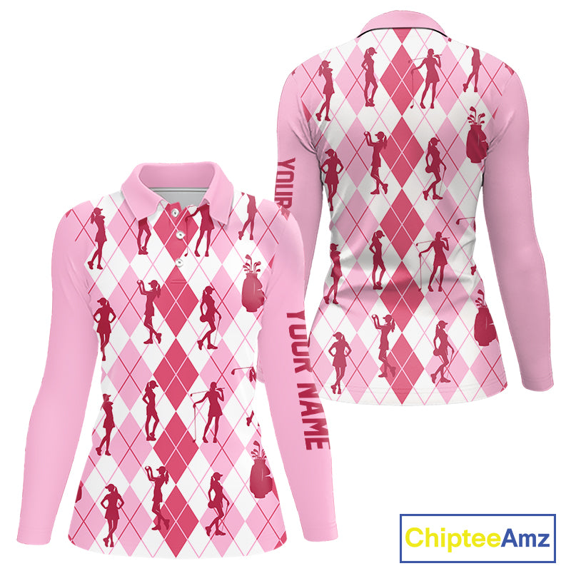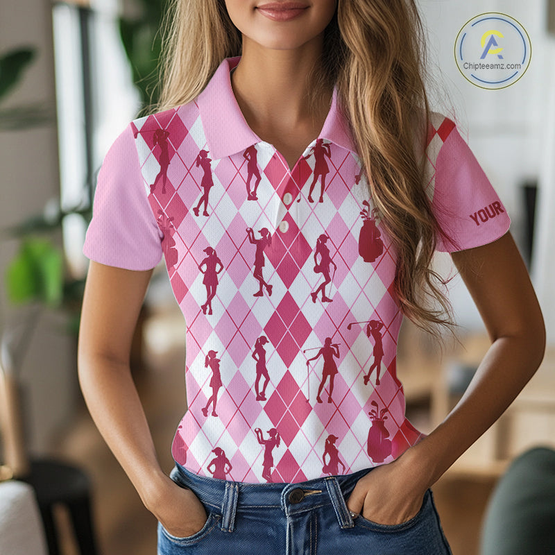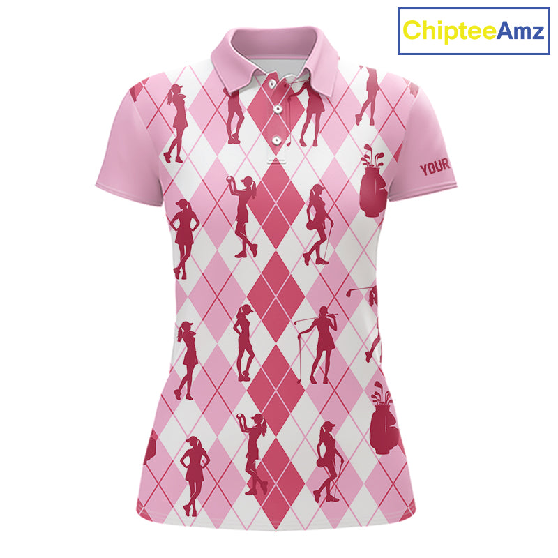 Light Pink Argyle Womens Golf Polo Shirts, Golf Shirts Custom Team Golf Polo For Ladies Team Golf Tops NBT491