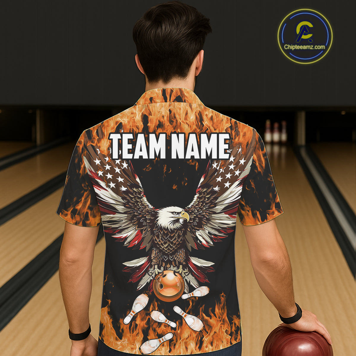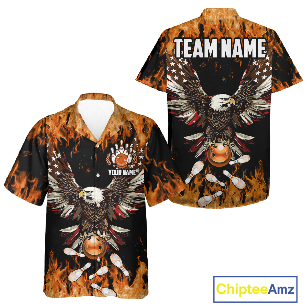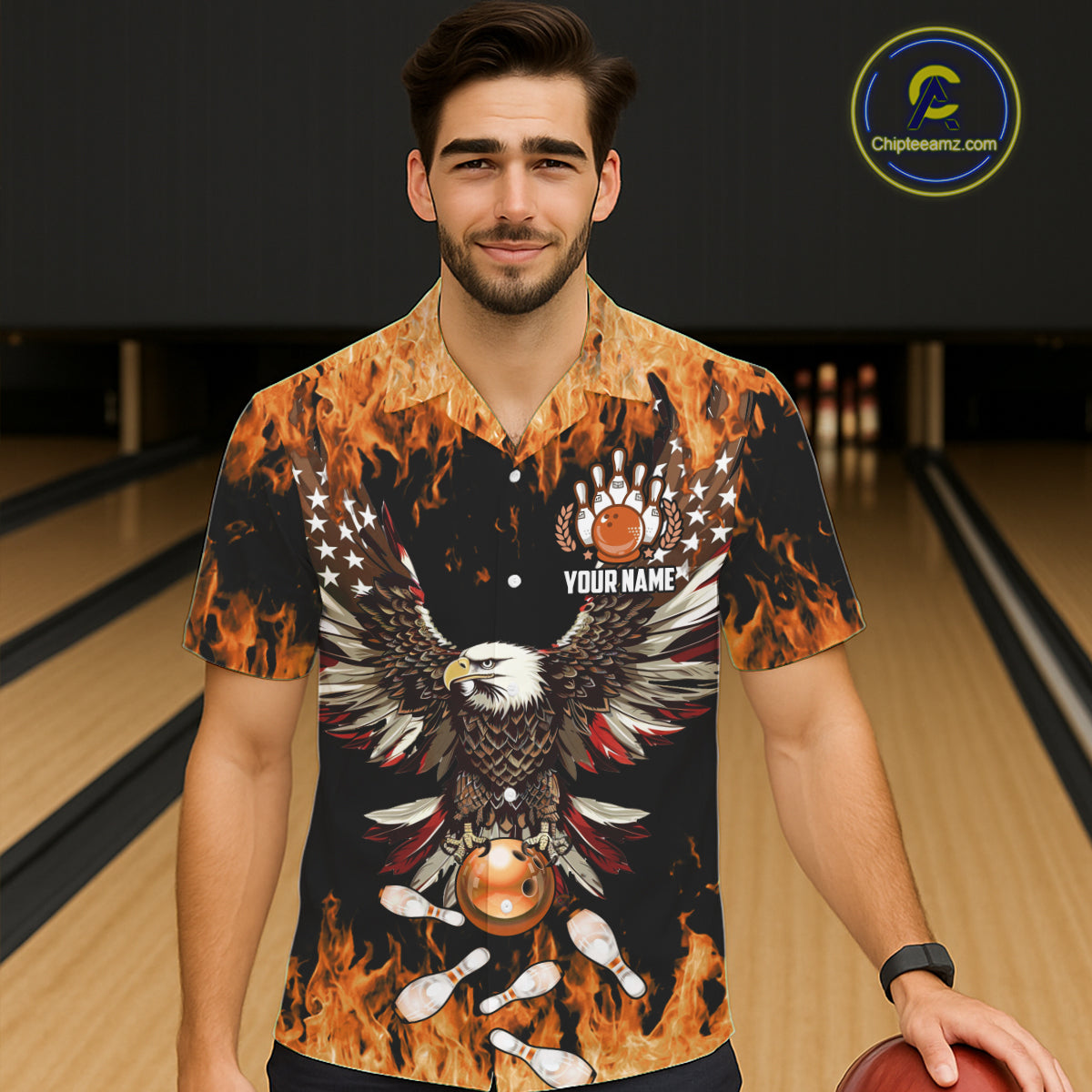 Orange flame Hawaiian bowling shirts Custom American flag Eagle Team bowling shirts, gift for bowlers NQS11189