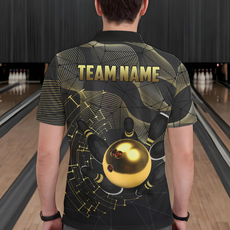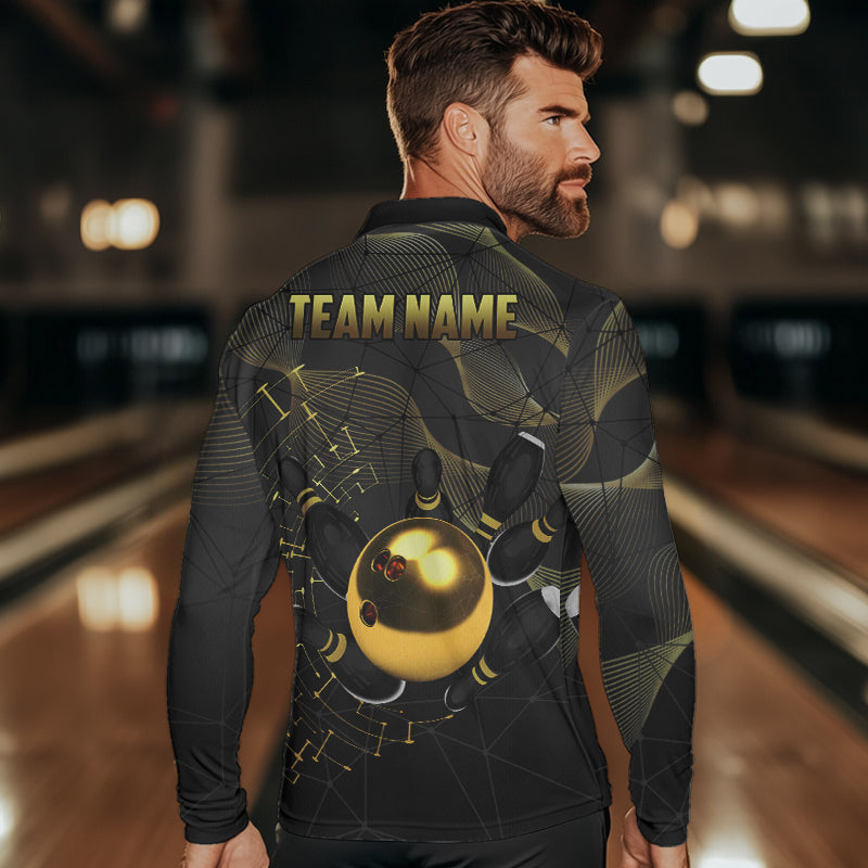 Personalized Black and Gold Bowling Polo, Quarter Zip Shirts For Men Custom Bowling Team League Jersey NQS9688