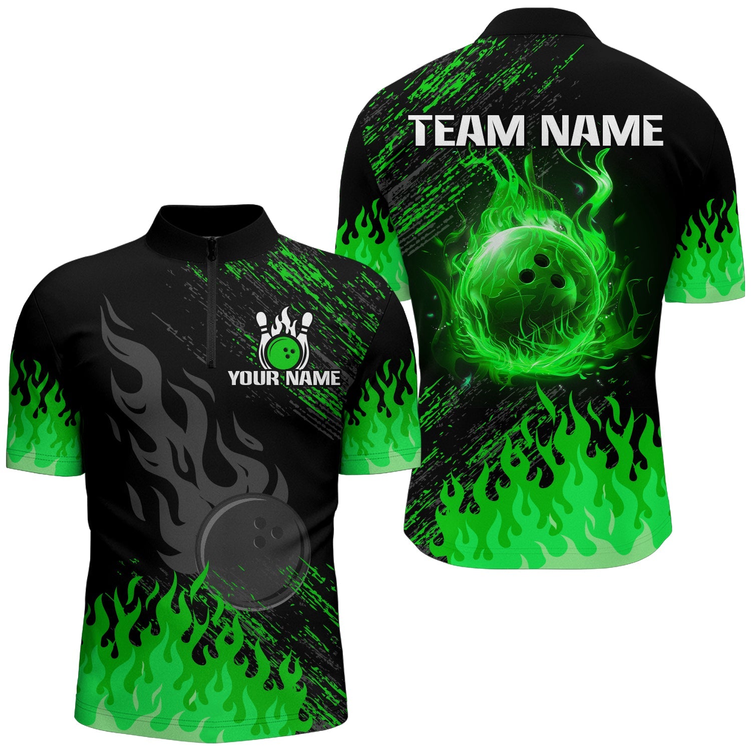 Personalized black and green Flame bowling Polo, Quarter Zip shirts for Men, custom bowling jerseys NQS8292