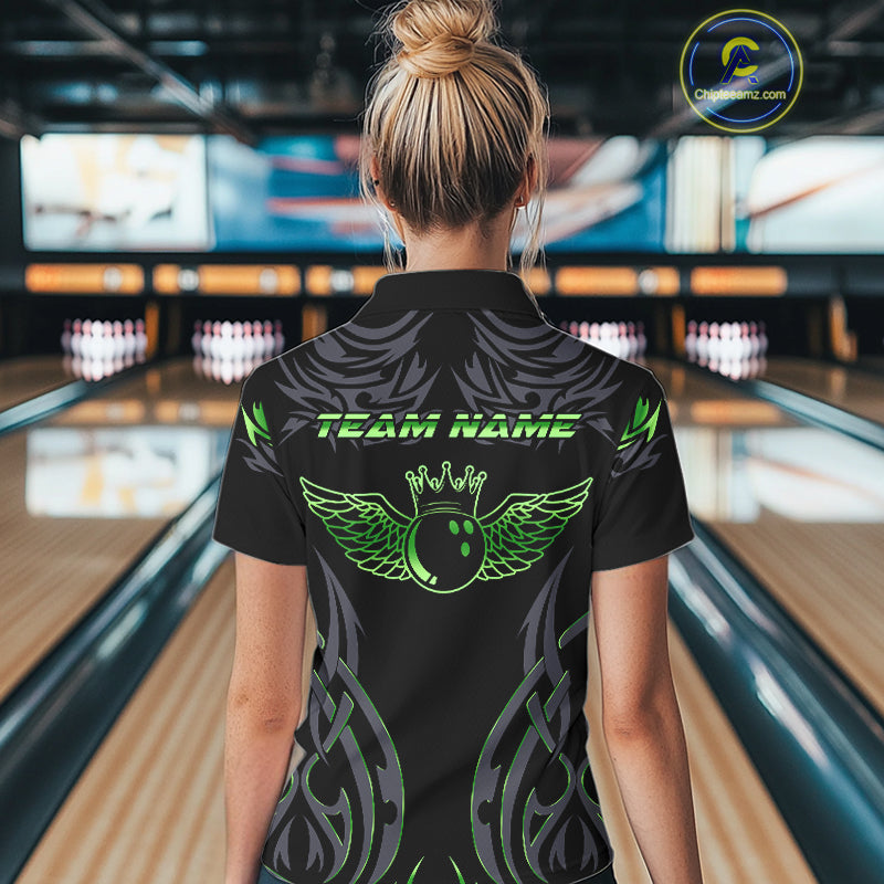 Personalized Black And Green tribal pattern Bowling Shirts For Women, angel wings Bowling Team jersey NQS10759