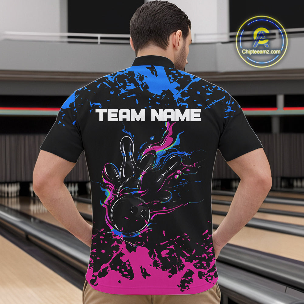 Personalized Black, Blue and Pink Bowling Shirts For Men, Bowling Balls And Pins Bowling Team Shirts NQS10742