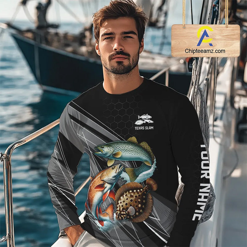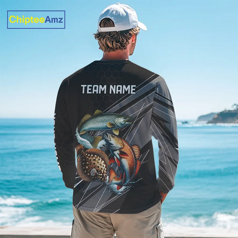 Personalized Black camo Inshore Slam Redfish, Trout, Flounder Fishing Jersey Fishing Tournament Shirt NQS11036