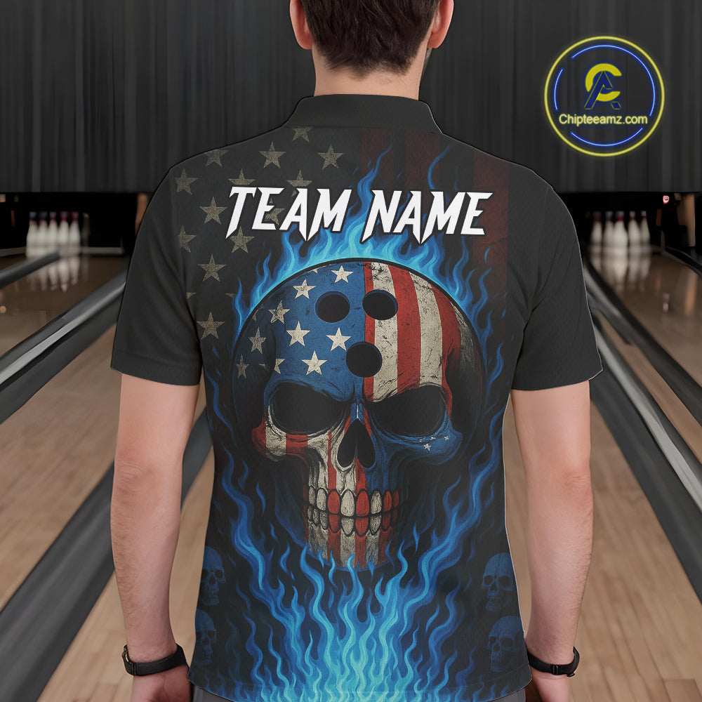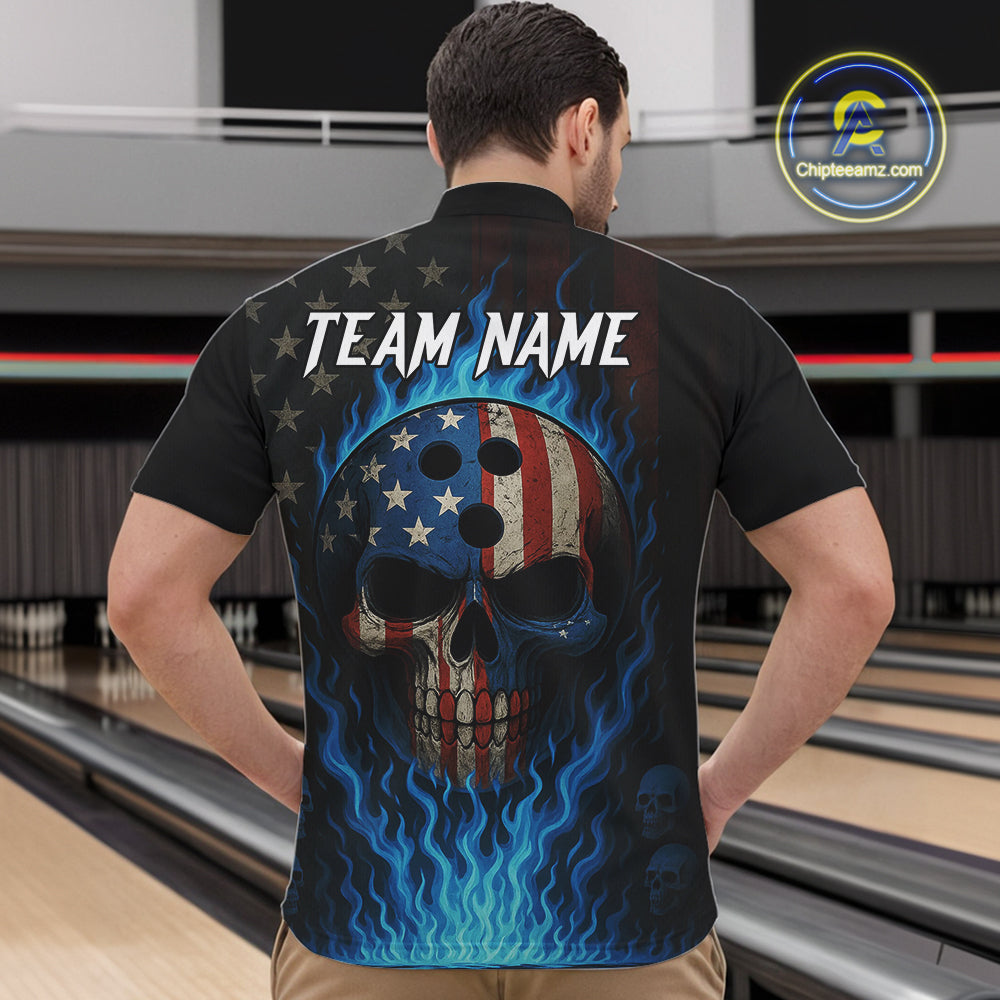 Personalized Blue Flame American Flag Skull Patriotic Bowling Polo, Quarter Zip Shirts for Men NQS10914