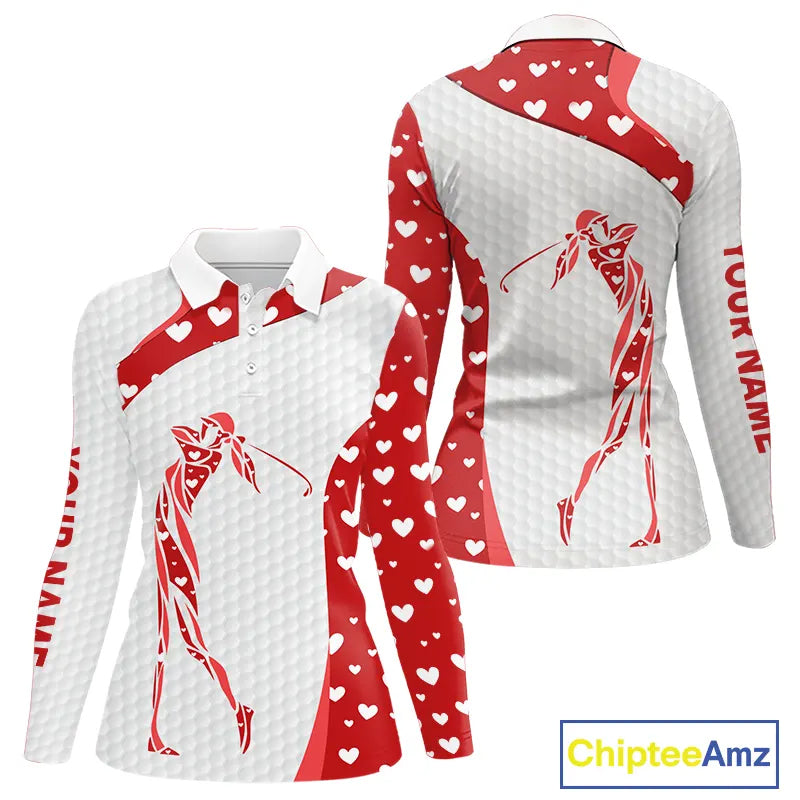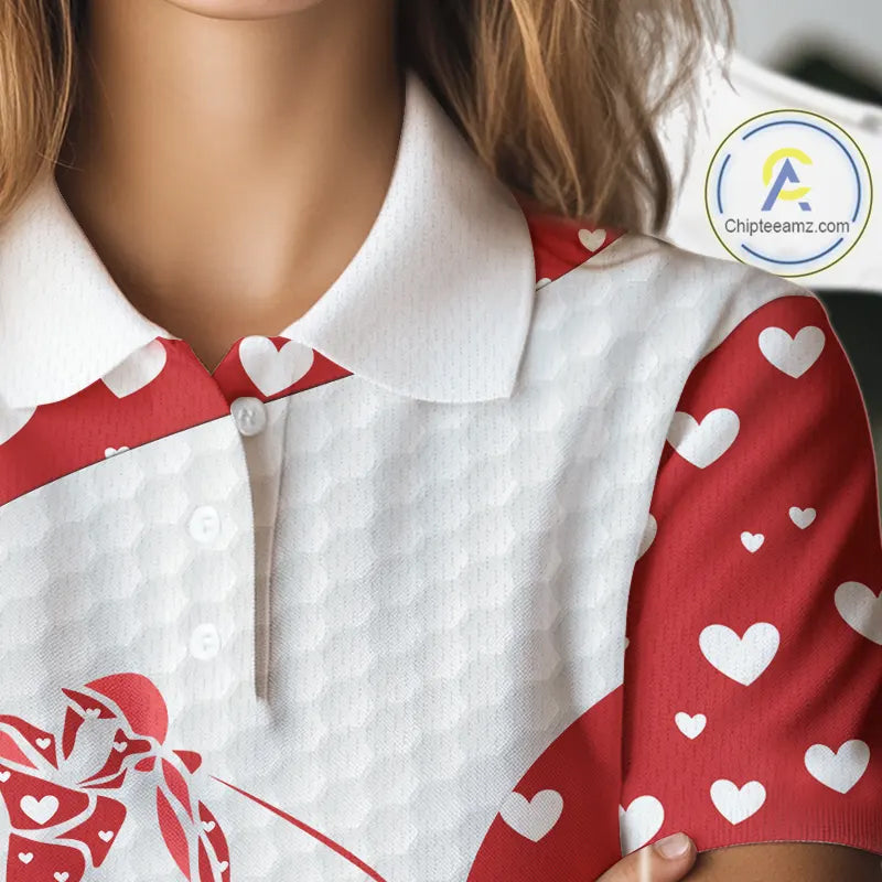 Personalized Red Hearts pattern golf white Womens golf polo shirts custom name Valentine golf gifts NQS11259