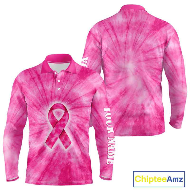 Pink Breast Cancer Golf Shirt Custom Long Sleeve Golf Polo Shirt Tie Dye pattern, Golf Gifts NHN0153
