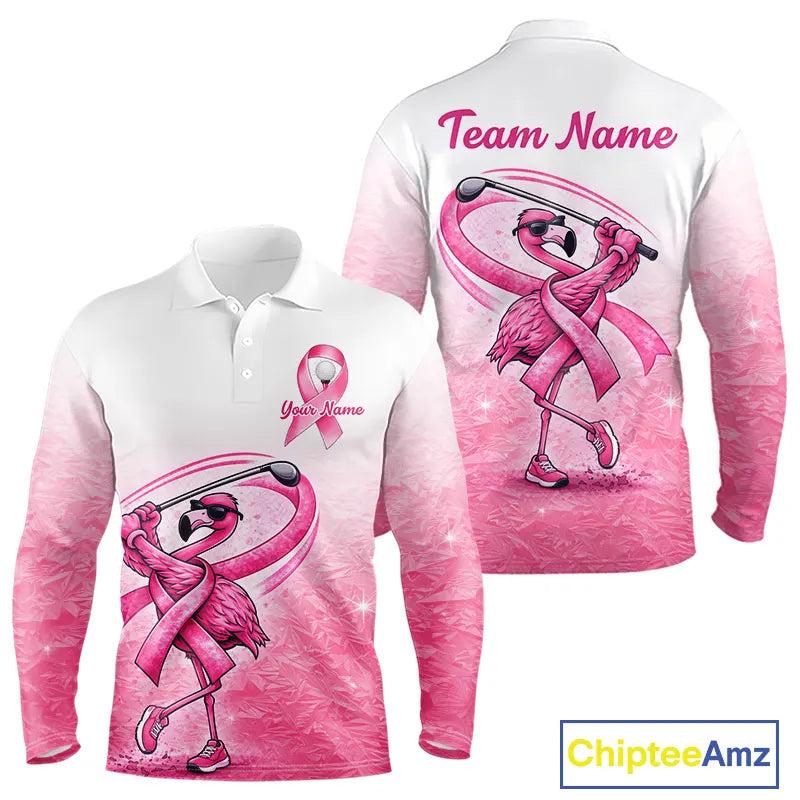 Pink Breast Cancer Golf Shirt, Funny Flamingo Long Sleeve Golf Polo Shirt Custom Name Golf Gifts NHN0167