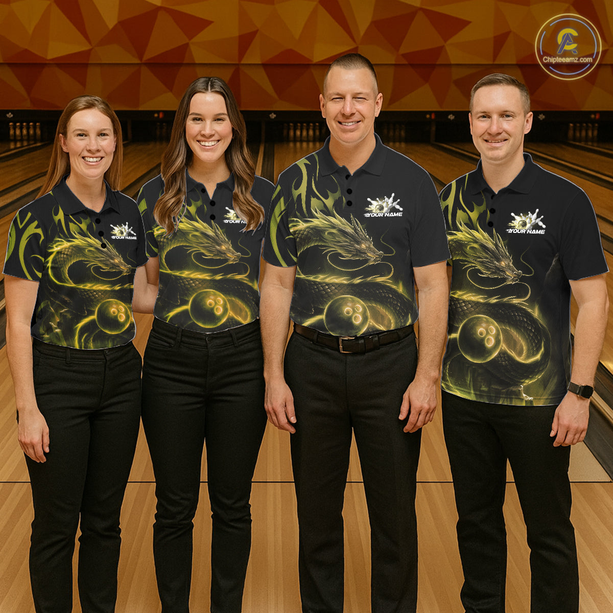 Custom Gold Tribal Flame Dragon Bowlin Team Men Polo Shirt, Dragon Bowling Jerseys IPHW10232
