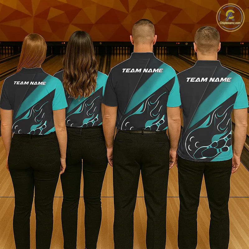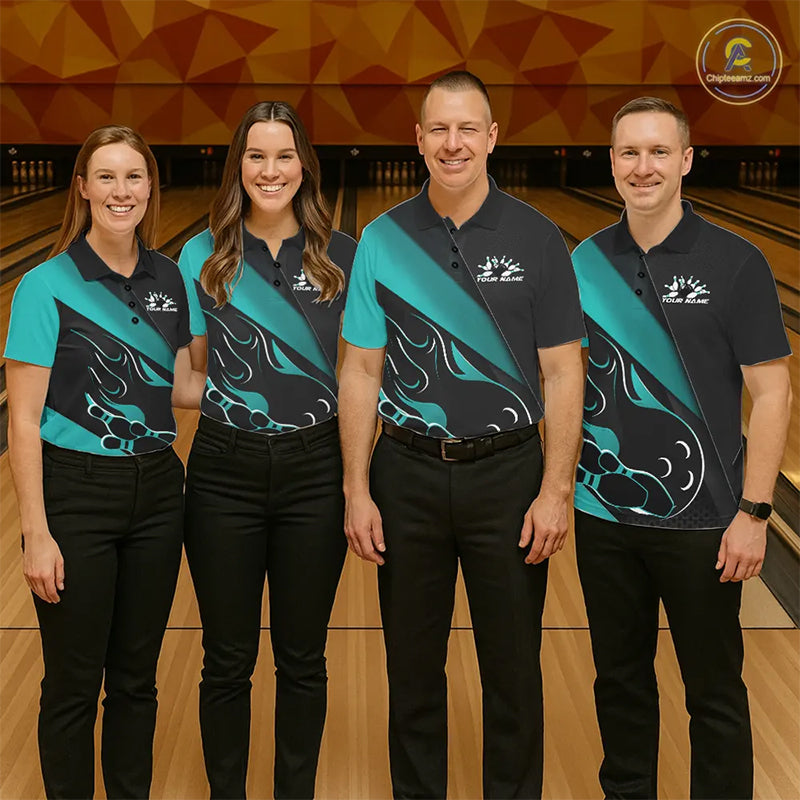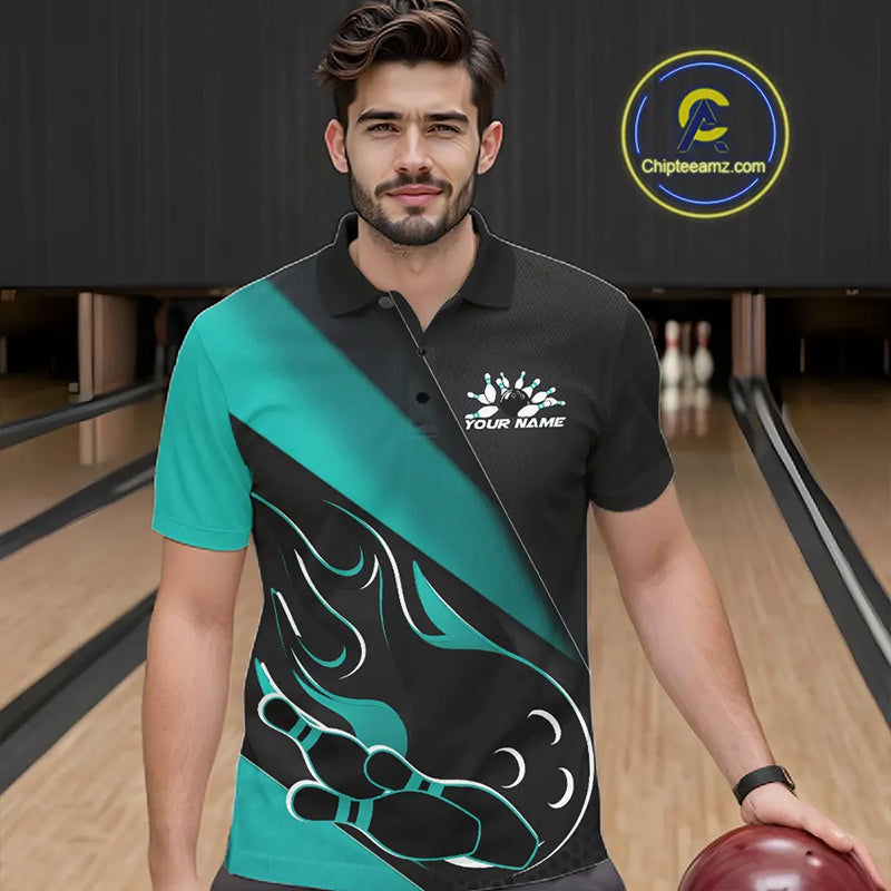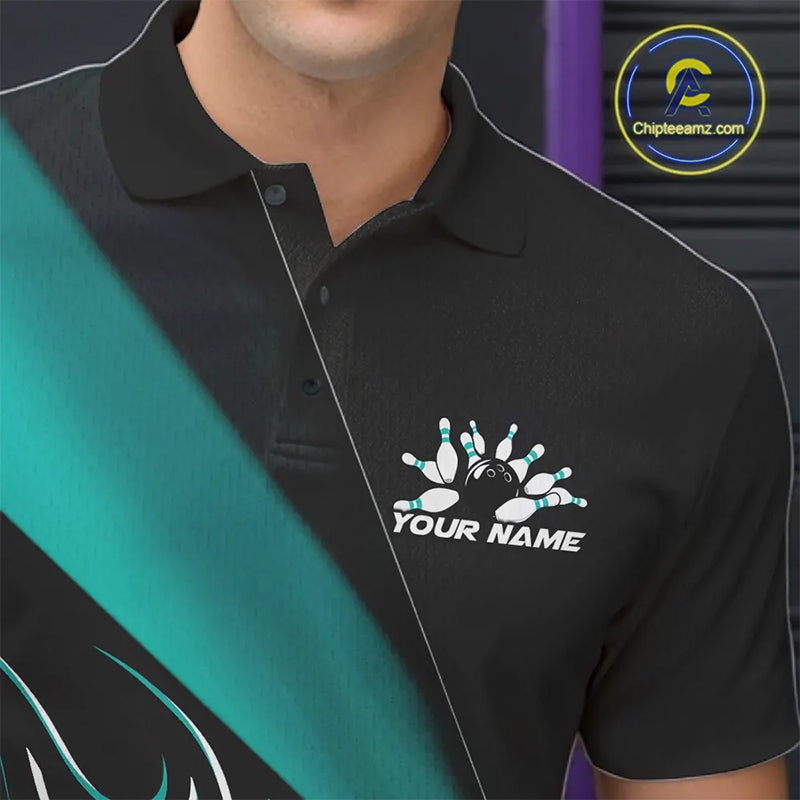 Custom Black And Turquoise Blue Flame Bowling Men Polo Shirt, Team Bowling League Shirt IPHW10255