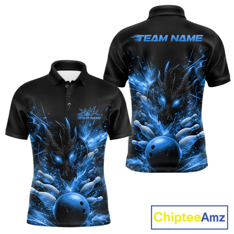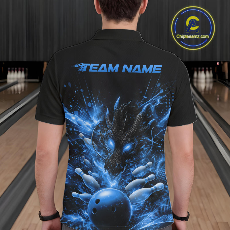 Custom Blue Fire Flame Dragon Bowling Jerseys. Dragon Bowling Men Polo Shirt IPHW10282