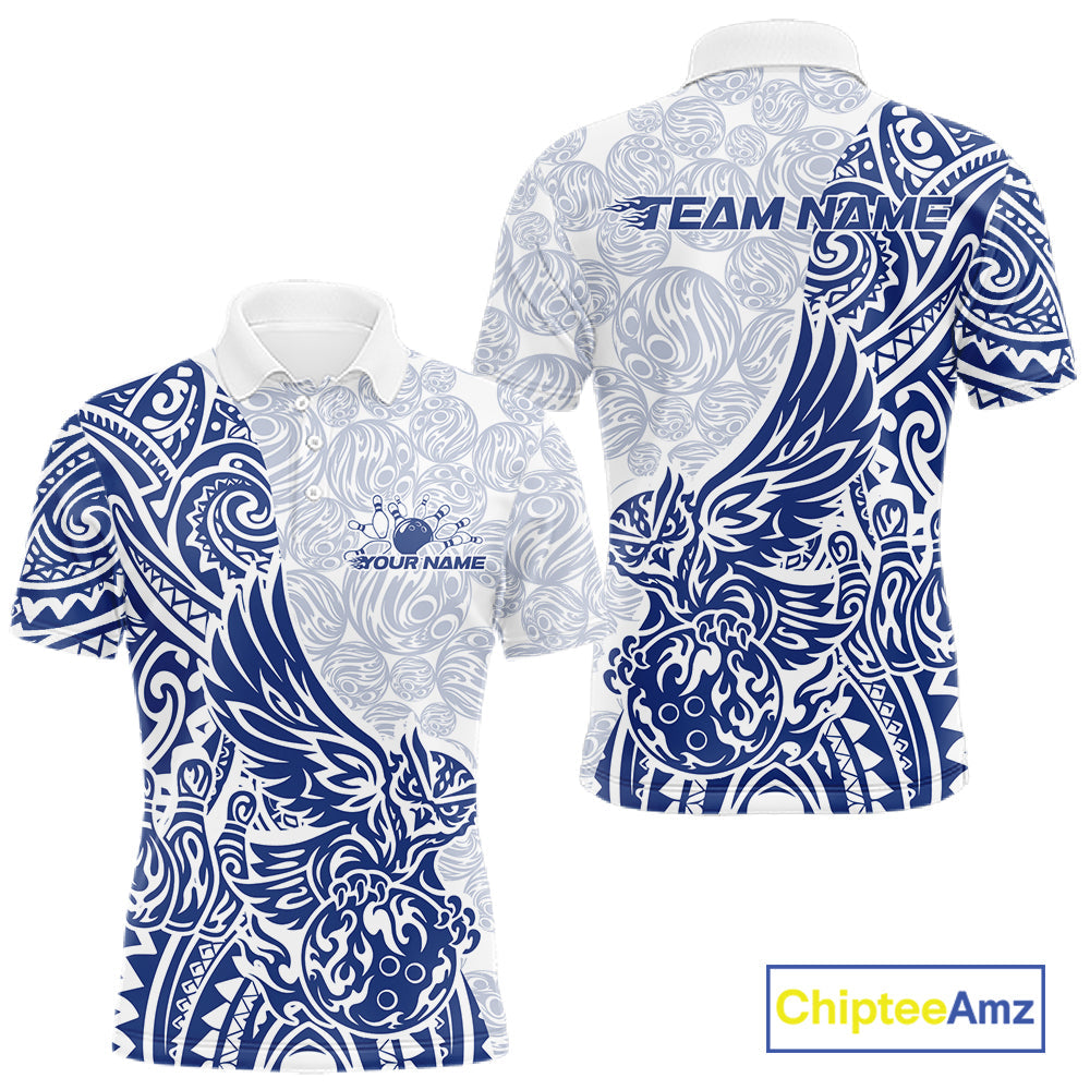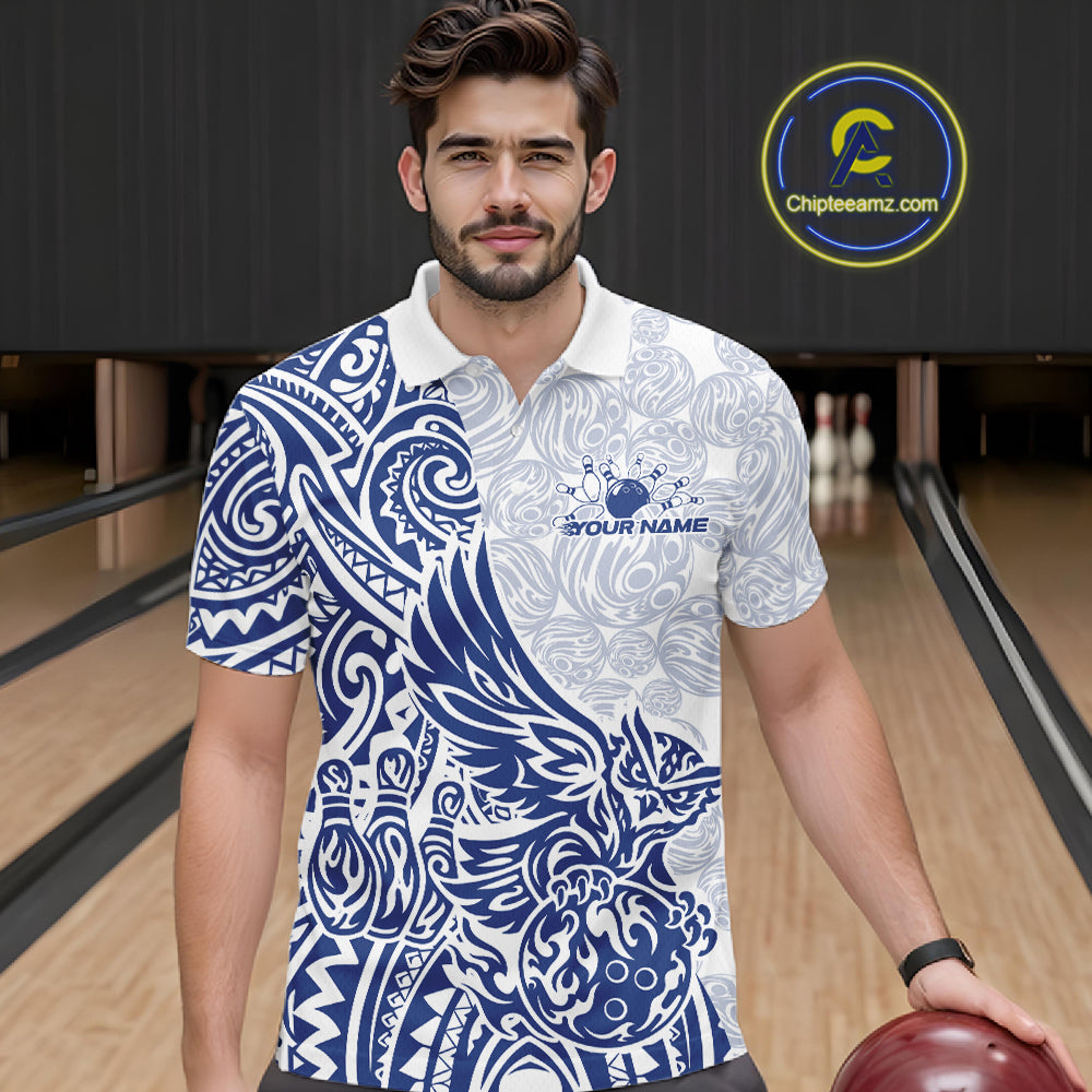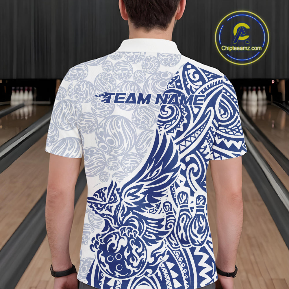 Custom Blue Tribal Tattoo Pattern Polynesian Owl Bowling Men Polo Shirts IPHW10334