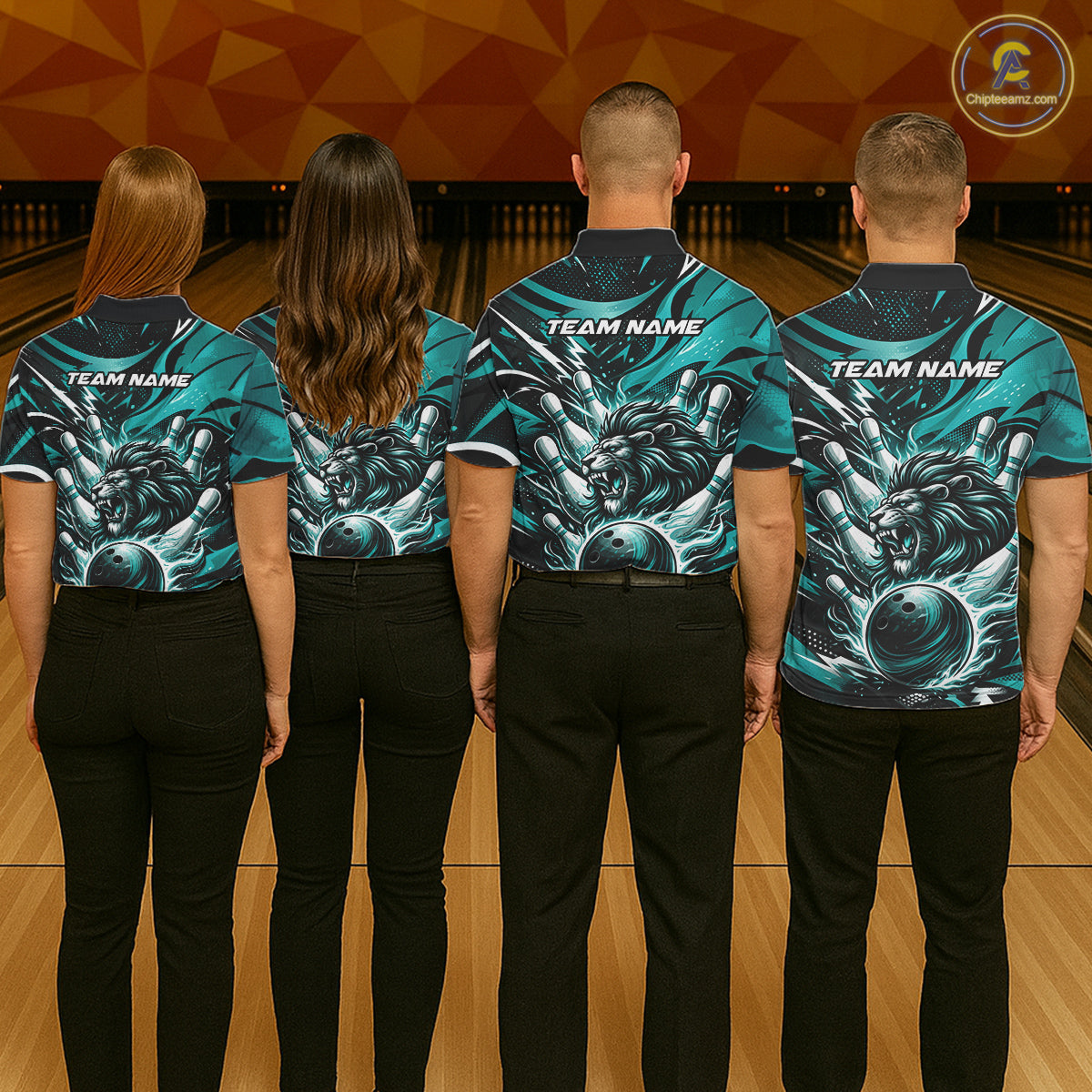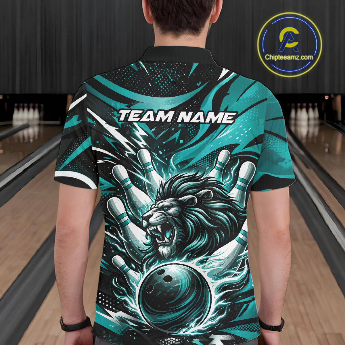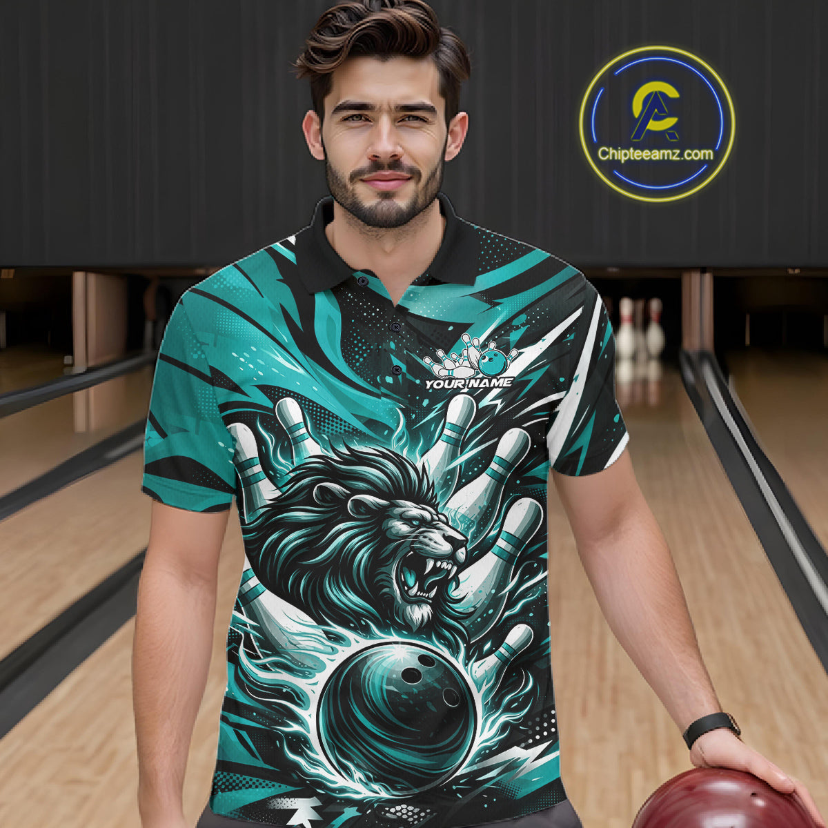 Custom Turquoise Blue Flame Bowling Ball Lion Bowling Jerseys, Lion Men Polo Bowling Shirt IPHW10350