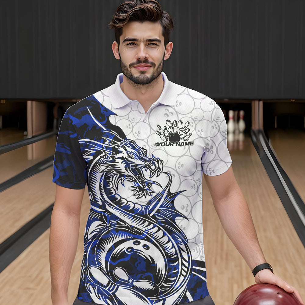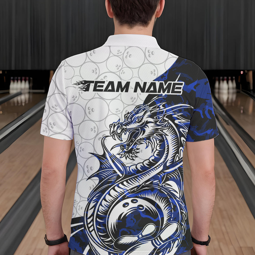 Custom Blue Camo Dragon Bowling Tattoo Men Polo Shirts, Dragon Bowling League Team Shirt IPHW8884