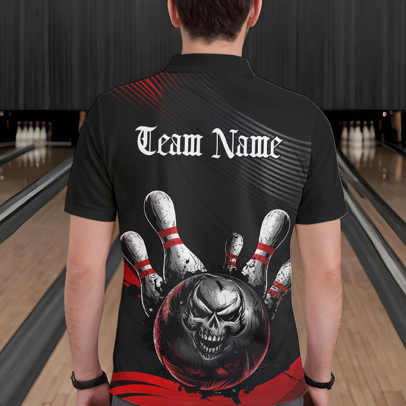 Custom Black And Red Grunge Style Skull Bowling Polo Shirts For Men, Bowling Team Uniform IPHW8907