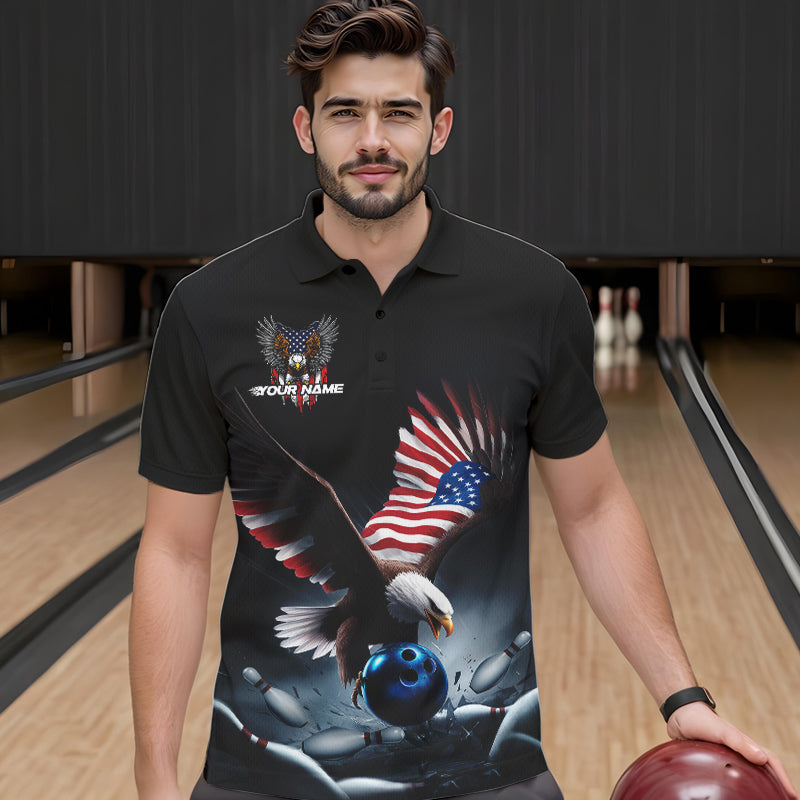 Custom American Flag Eagle Bowling Team Men Polo Shirts, Patriotic US Bowling League Shirt IPHW8937