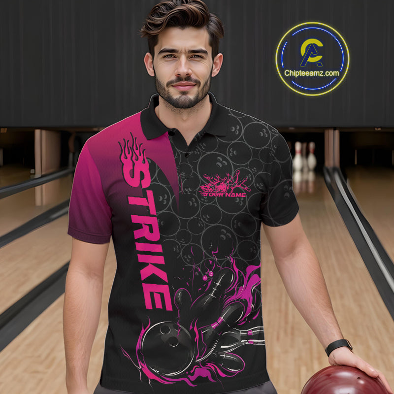 Custom Bowling Pattern Pink Flame Strike Bowling Team Men Polo Shirts, Bowling Jerseys IPHW9417
