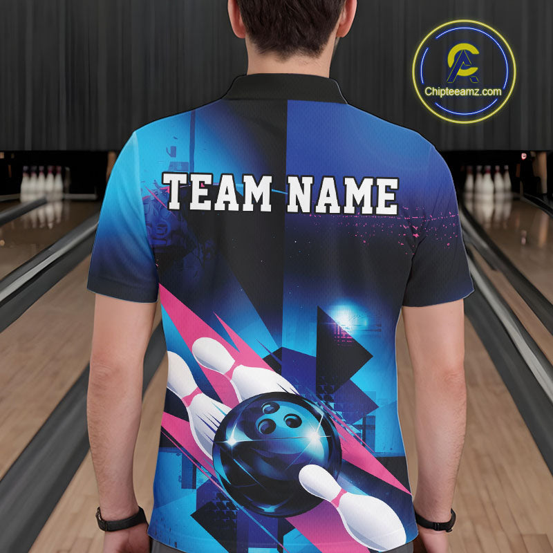 Custom Blue And Pink Futuristic Bowling Polo Team Shirts For Men, Bowling League Shirt IPHW9513