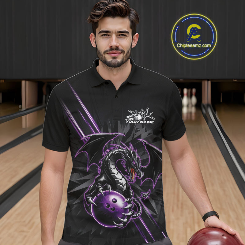 Custom Black And Purple Dragon Bowling Polo Shirts For Men, Dragon Bowling Team Shirt IPHW9538
