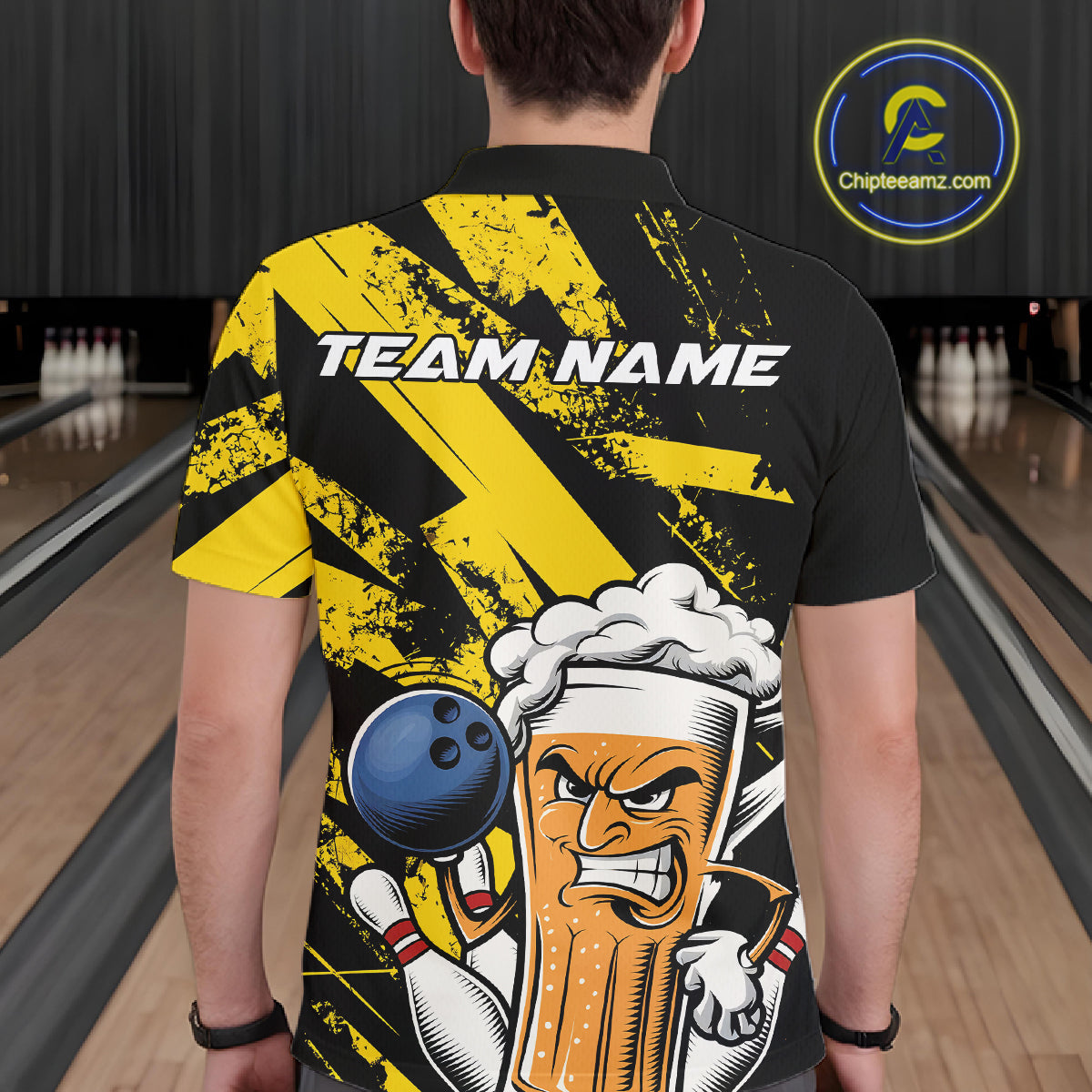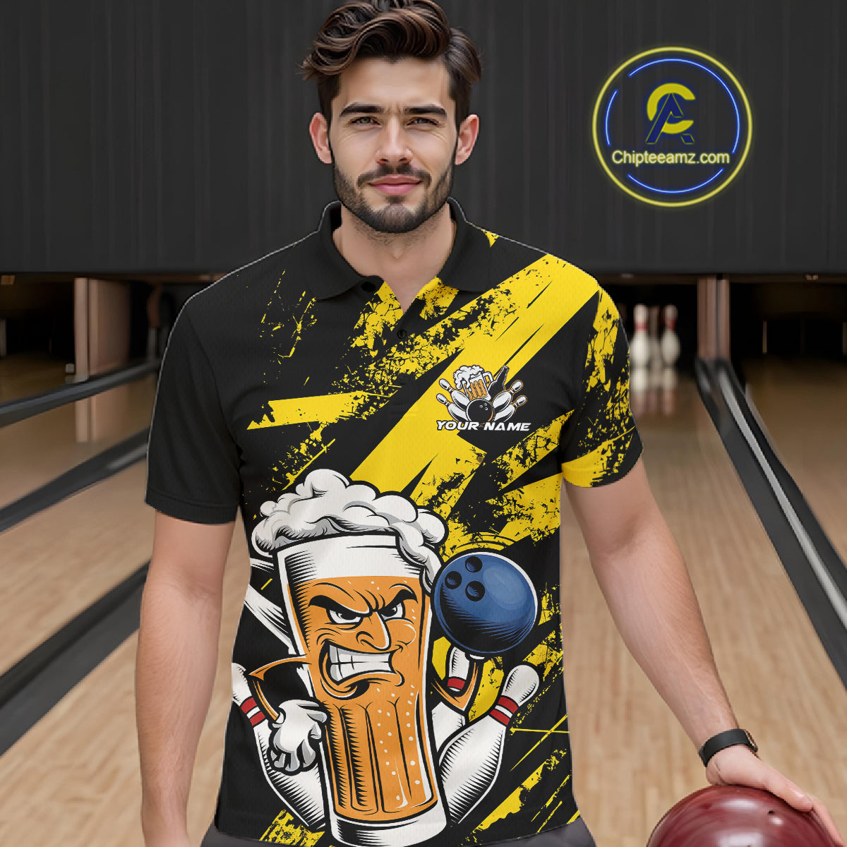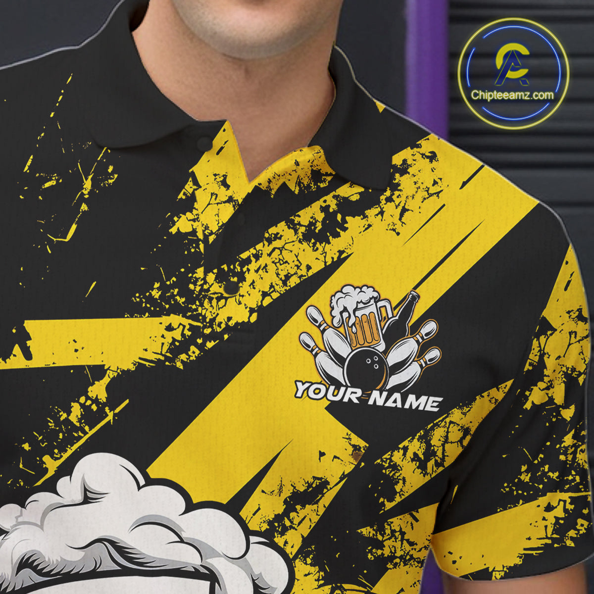 Custom Grunge Yellow Funny Bowling And Beer Polo Shirts For Men, Bowling Team Uniform IPHW9607