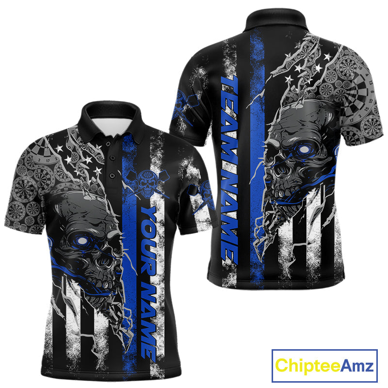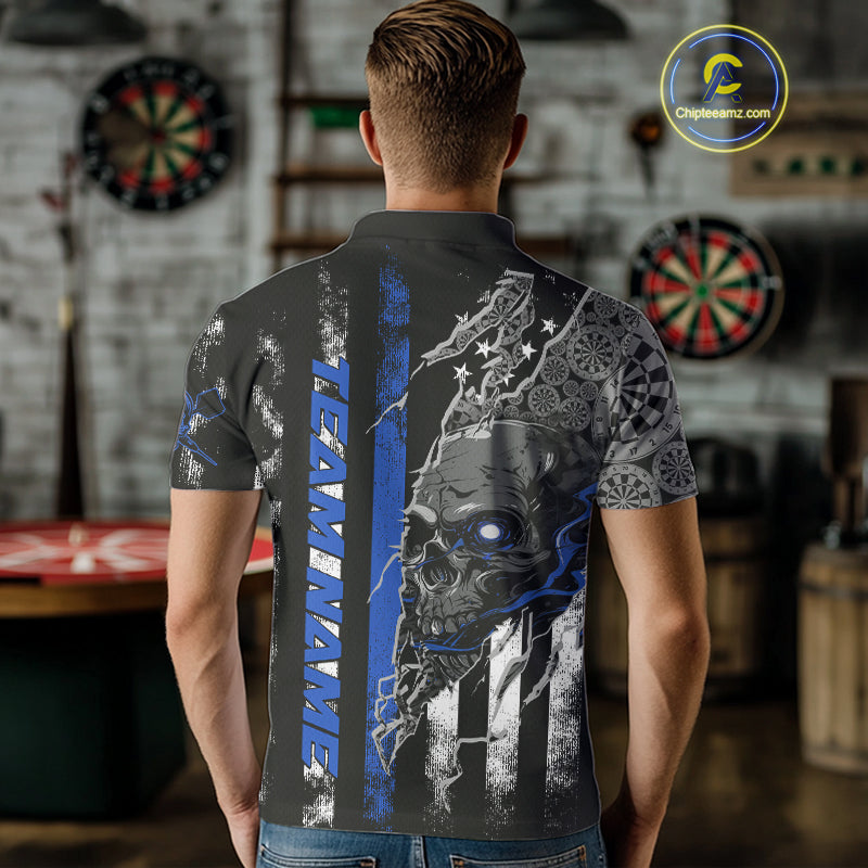 Custom Blue Line American Flag Patriotic Skull Dart Men Polo Shirts, Halloween Dart Outfit IPHW9692
