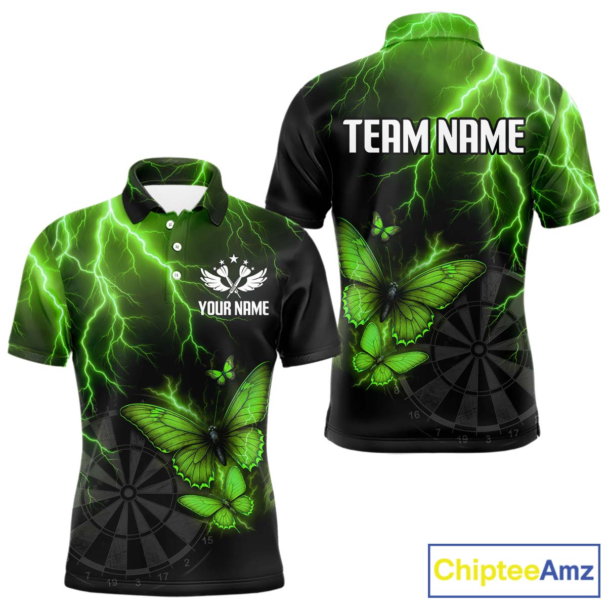Custom Men Polo Darts Shirt With Emerald Lightning & Glowing Butterfly, Darts Jersey NYN1021