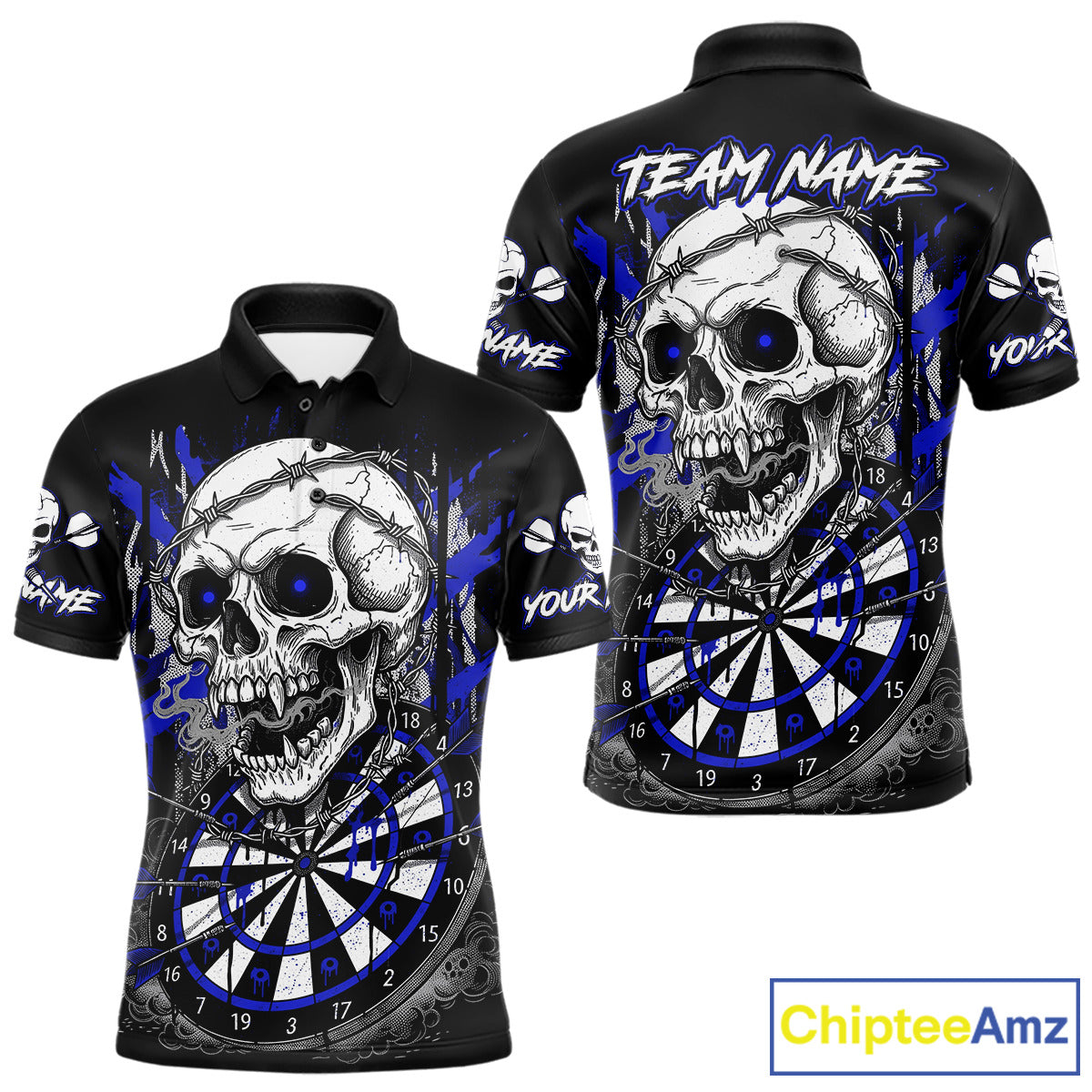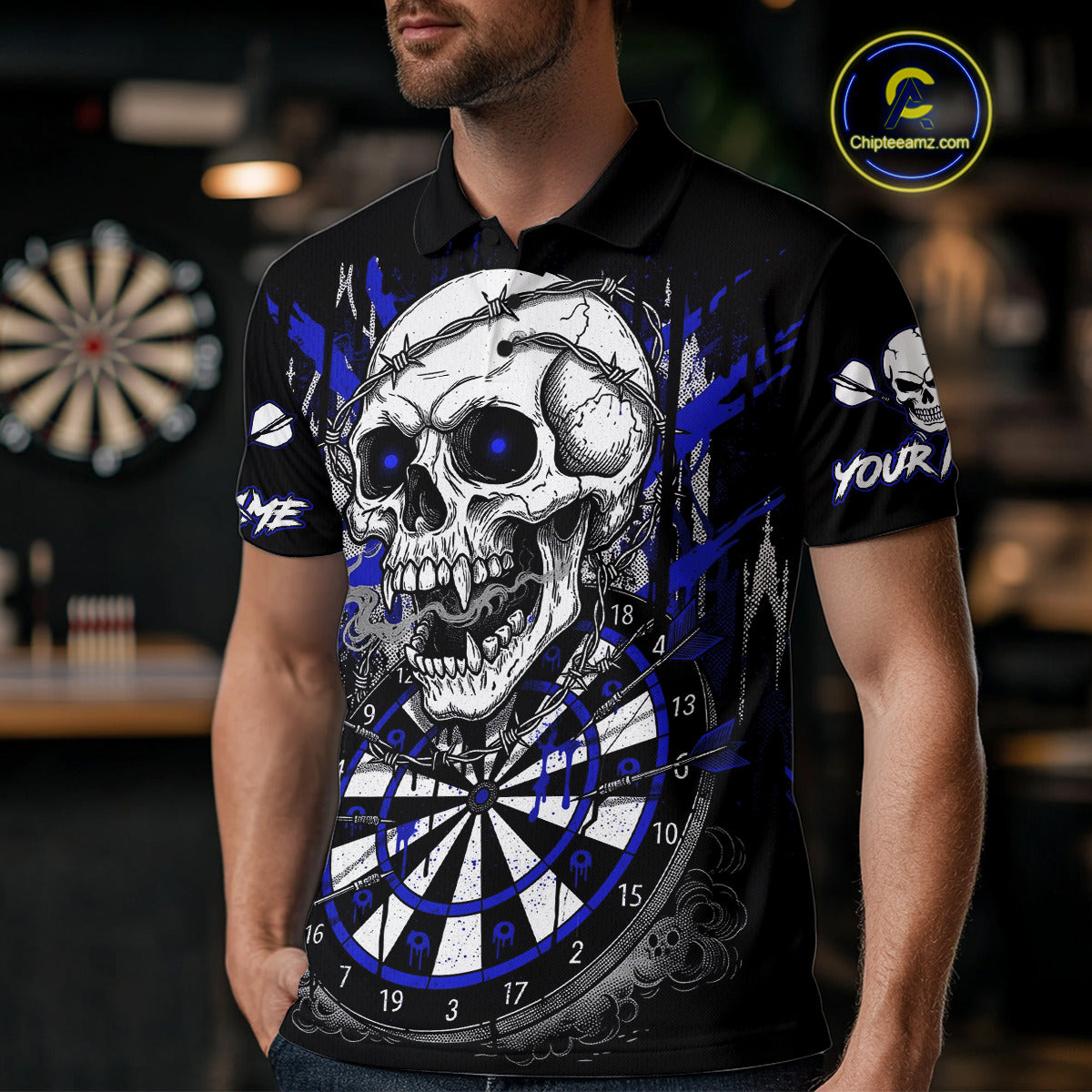 Custom Blue Grey Skull Barbed Wire Dartboard Grunge Darts Polo Shirt For Men Dart Gifts NYN1970