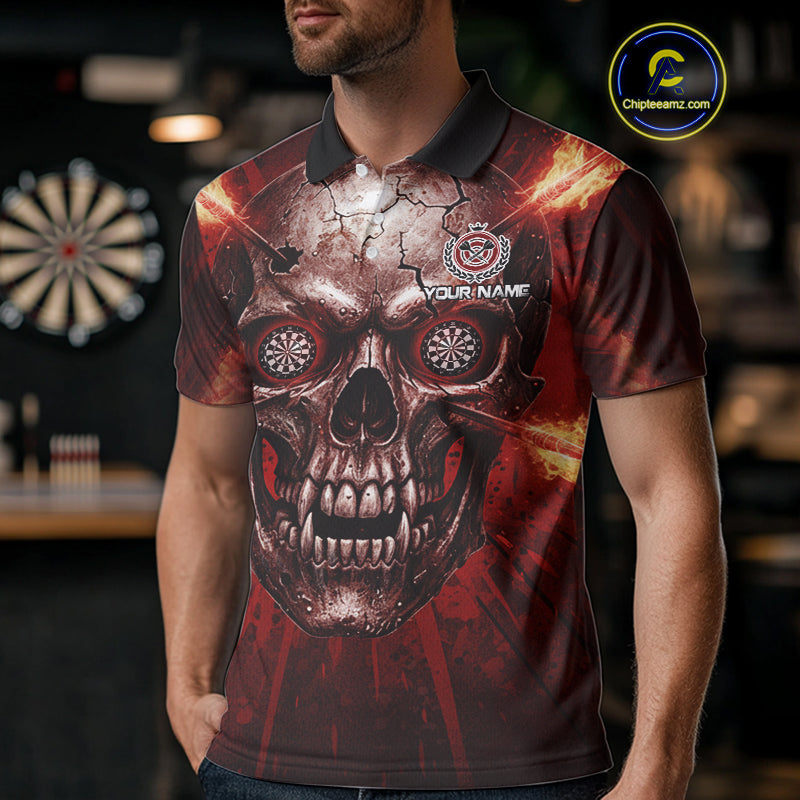 Custom Red Flames Dart Arrow Cracked Skull Men Darts Polo Shirt Grunge Dart Gifts NYN1989