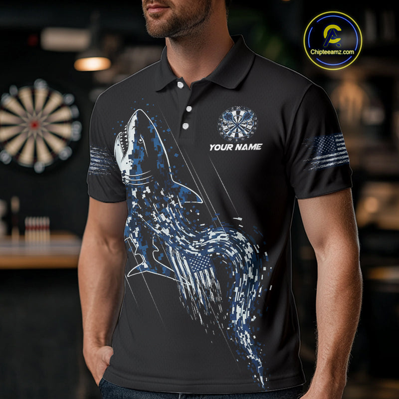 Custom Black And Blue US Flag Digital Camo Shark Darts Polo Shirt For Men Dart Gifts NYN1994