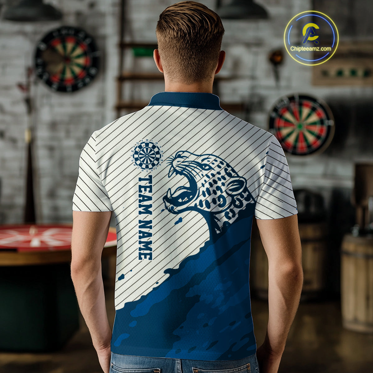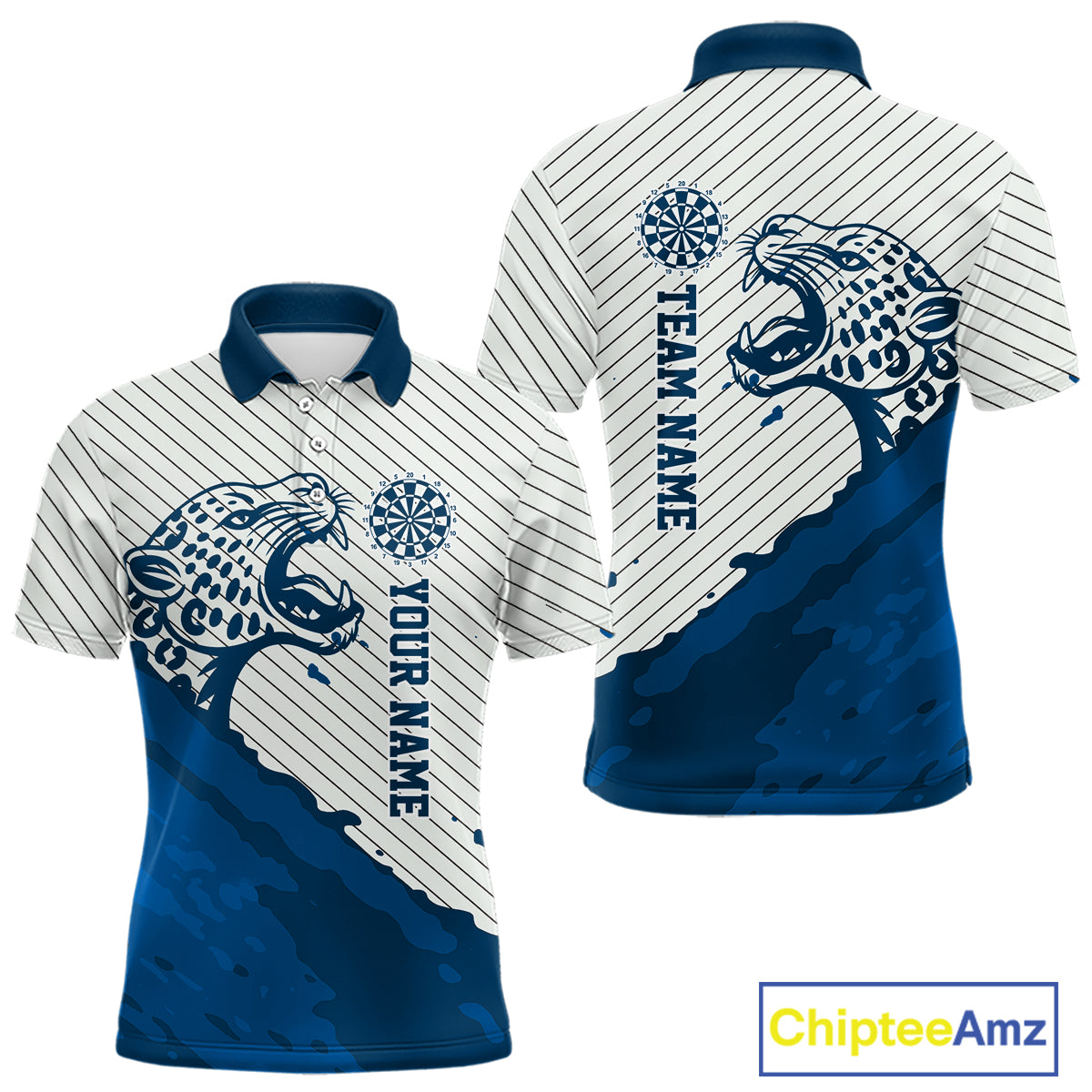 Personalized White And Blue Striped Leopard Darts Polo Shirts For Men Dart Team Jerseys NYN2198