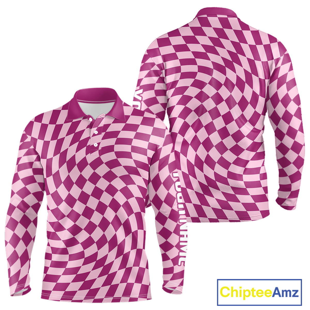 Plaid Long Sleeve Golf Polo Shirt Custom Purple & Pink Checkerboard Argyle Pattern Golf Shirts NHN0128