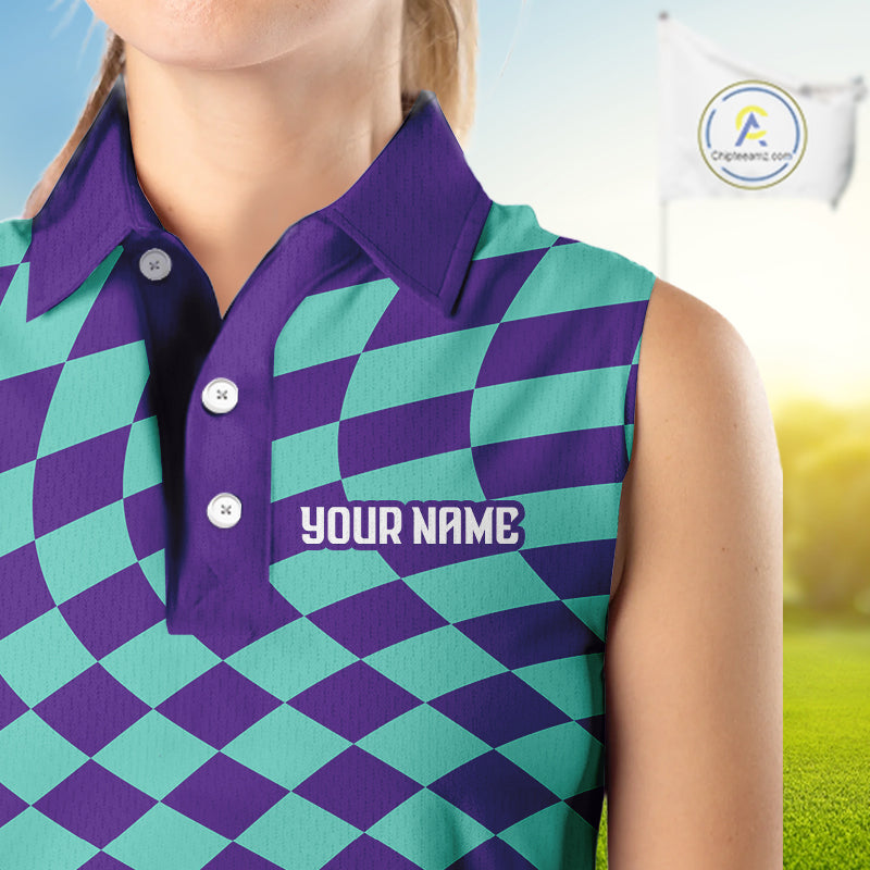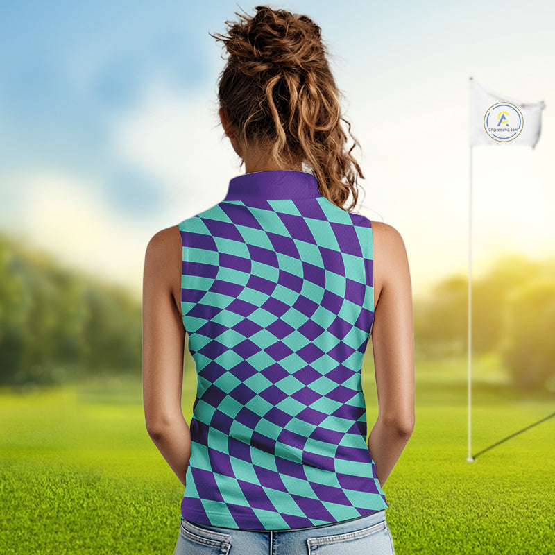 Plaid Womens Sleeveless Golf Polo Shirts Custom Purple & Blue Checkerboard Argyle Pattern Golf Shirt NHN0129