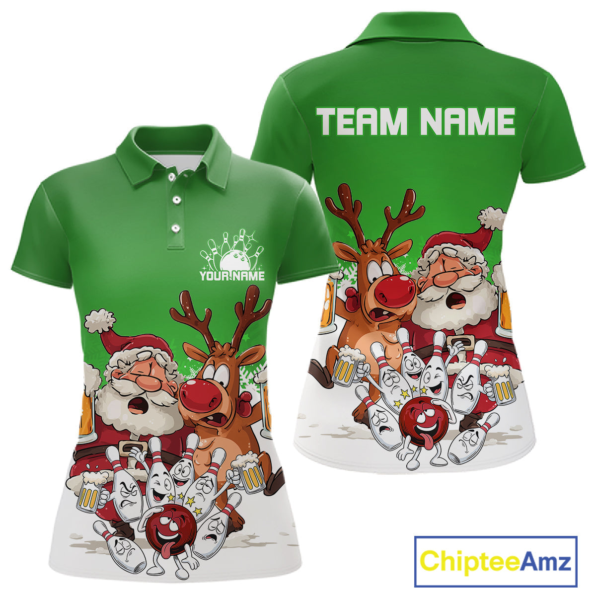 Custom Green Funny Christmas Women Bowling Shirts, Bowling And Beer Xmas Party Shirt IPHW10207