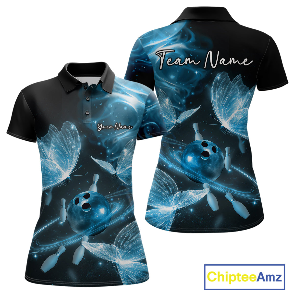Custom Ethereal Blue Butterflies Bowling Team Women Polo Shirts, Ladies Bowling Outfit IPHW10238