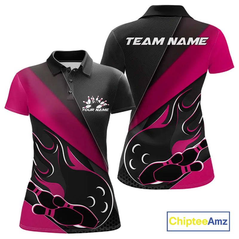 Custom Black And Pink Flame Bowling Women Polo Shirt, Team Bowling League Shirt IPHW10256