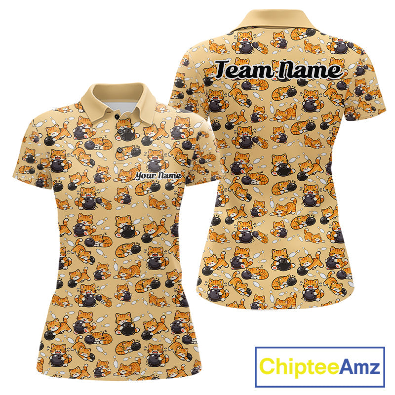 Custom Cute Ginger Tabby Cat Bowling Women Polo Shirts, Cat Bowling Team Shirt IPHW10306
