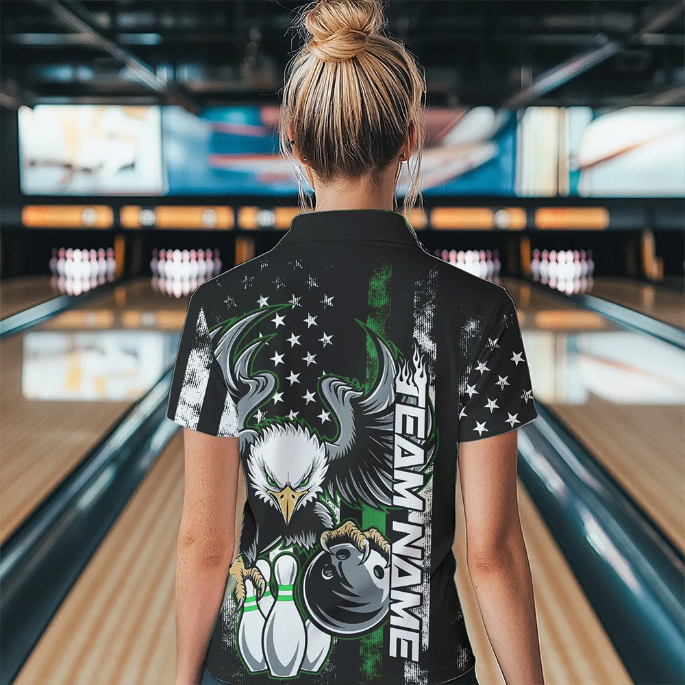 Custom Green Thin Line American Flag Eagle Bowling Women Polo Shirts, Patriotic US Bowling IPHW8737