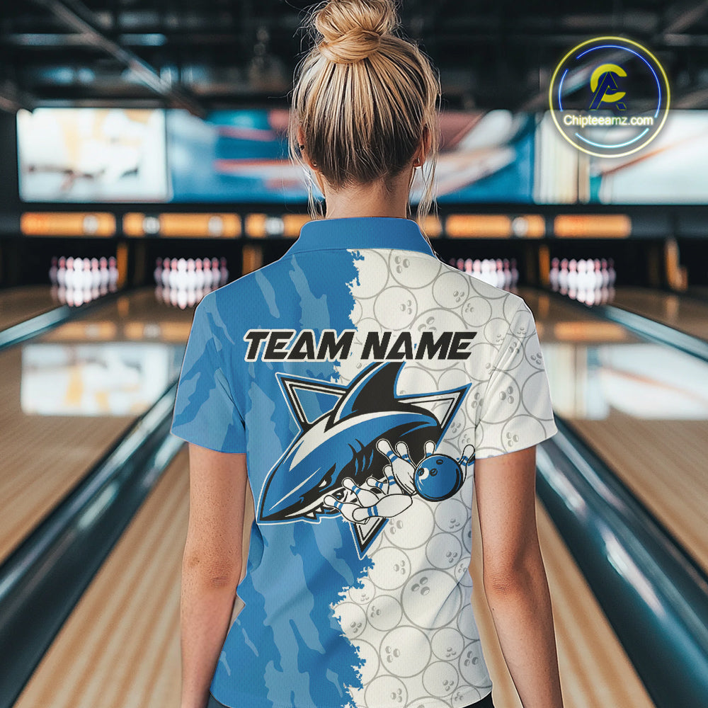 Custom White And Blue Shark Bowling Polo Shirts For Women, Shark Bowling League Shirt IPHW8993