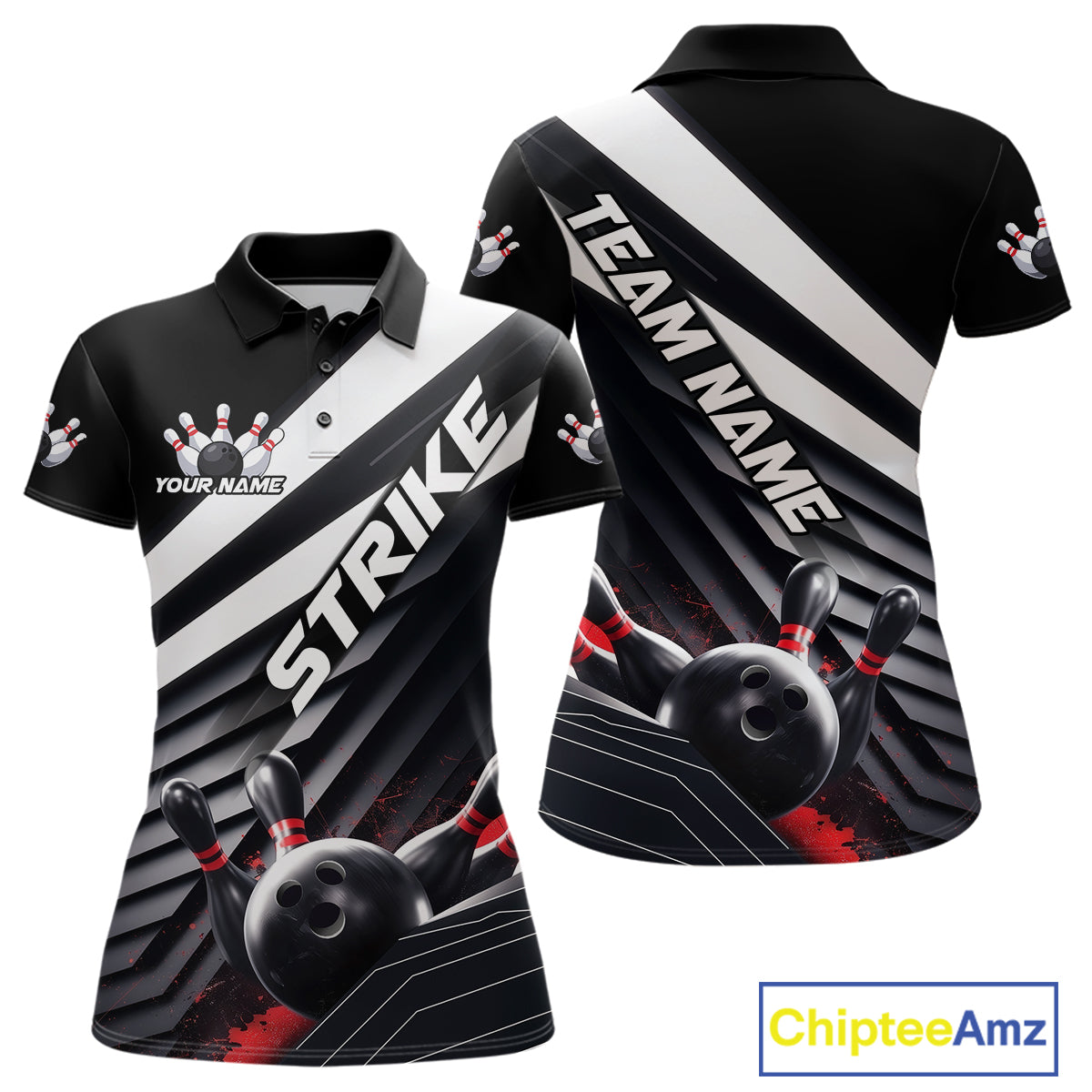 Custom Black And Red Strike Bowling Polo Shirts For Women, Bowling Team Uniform IPHW9627