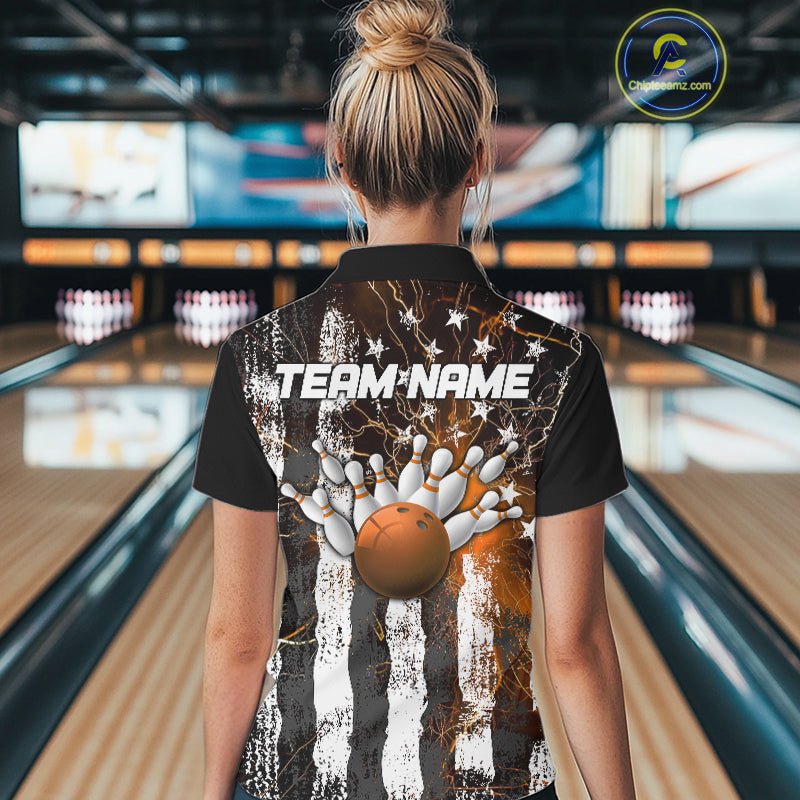 Orange Lightning US Flag Custom Bowling Team Jerseys, Patriotic Bowling Women Polo Shirt IPHW9917