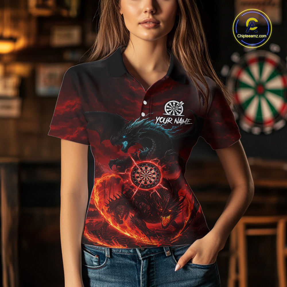 Double Dragon Red & Blue Flaming Dartboard Custom Polo Darts Shirt For Women Dart Gifts NYN2009