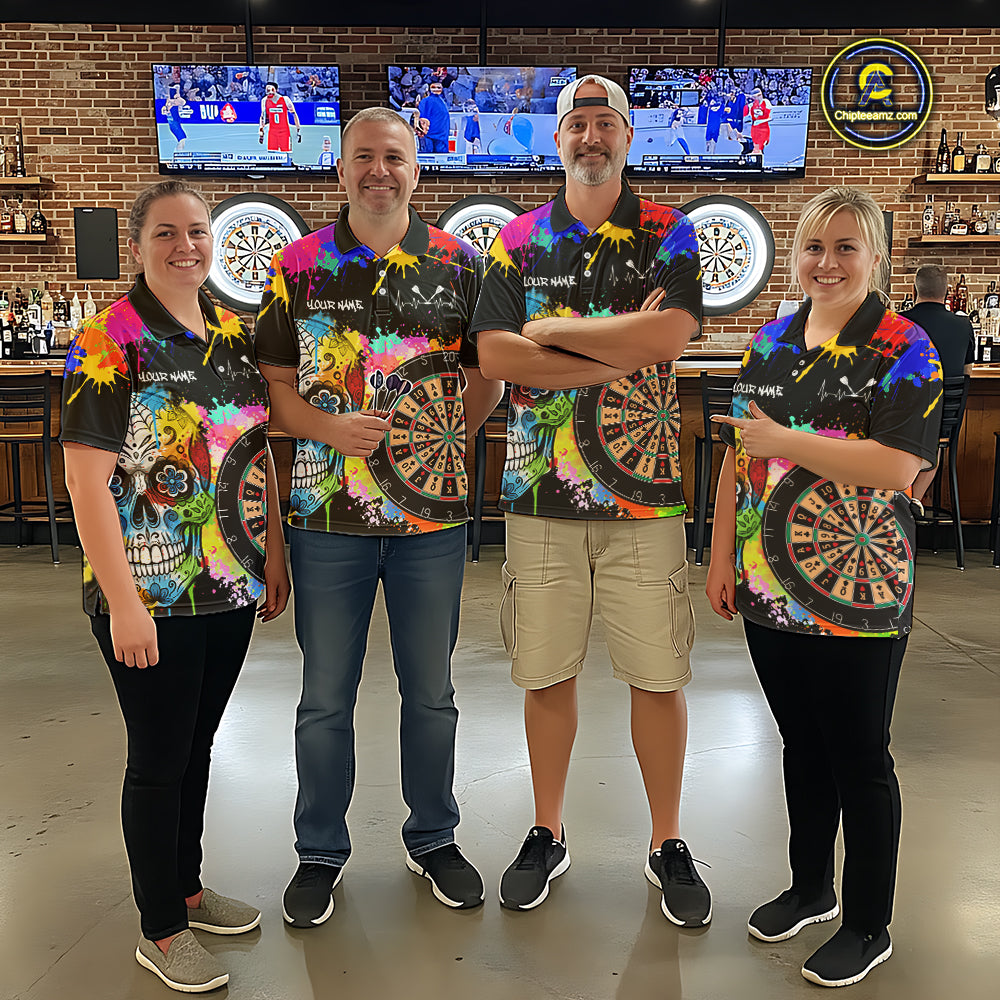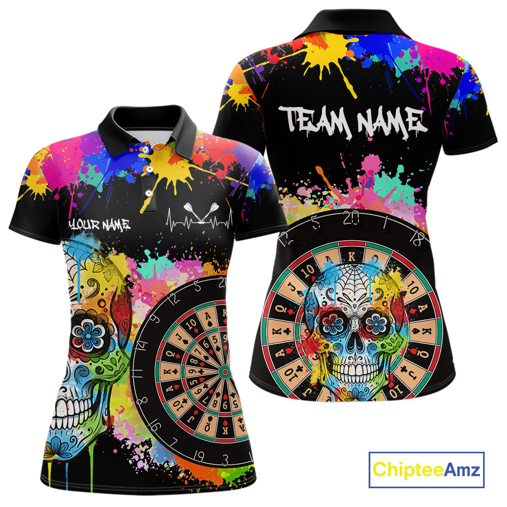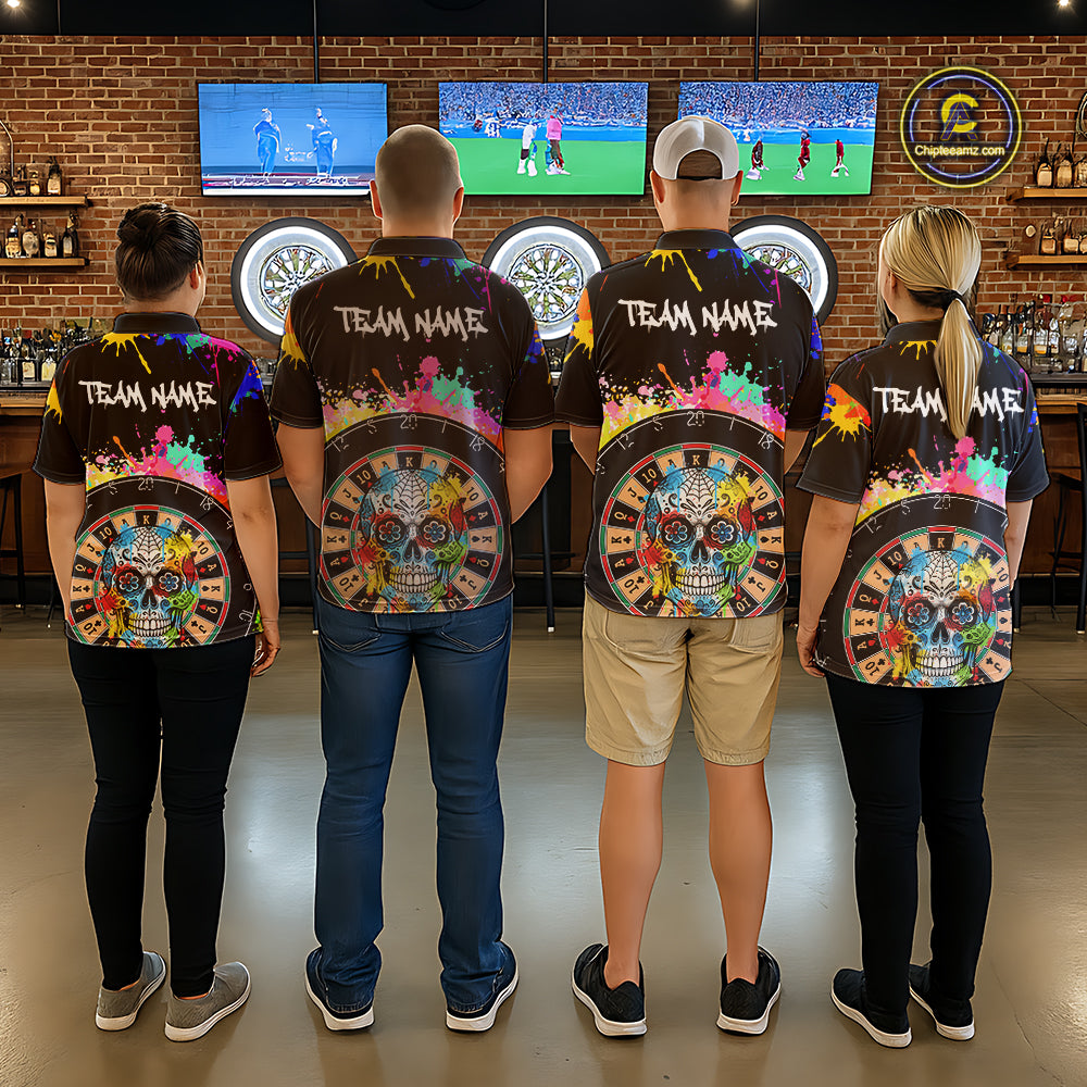 Custom Colorful Splatter Skull Dartboard Women Darts Polo Team Shirts Dart Jerseys | Black NYN2212