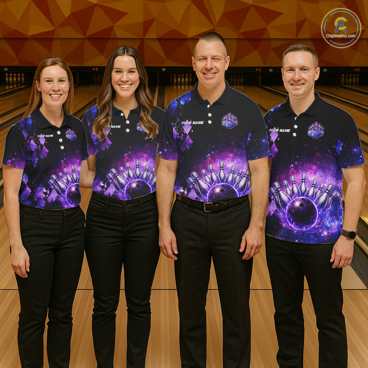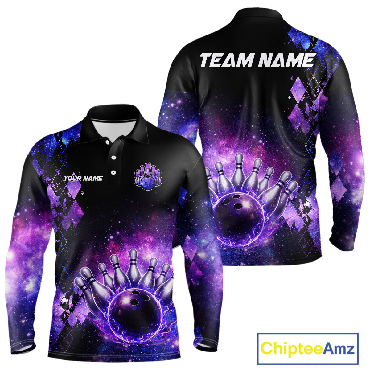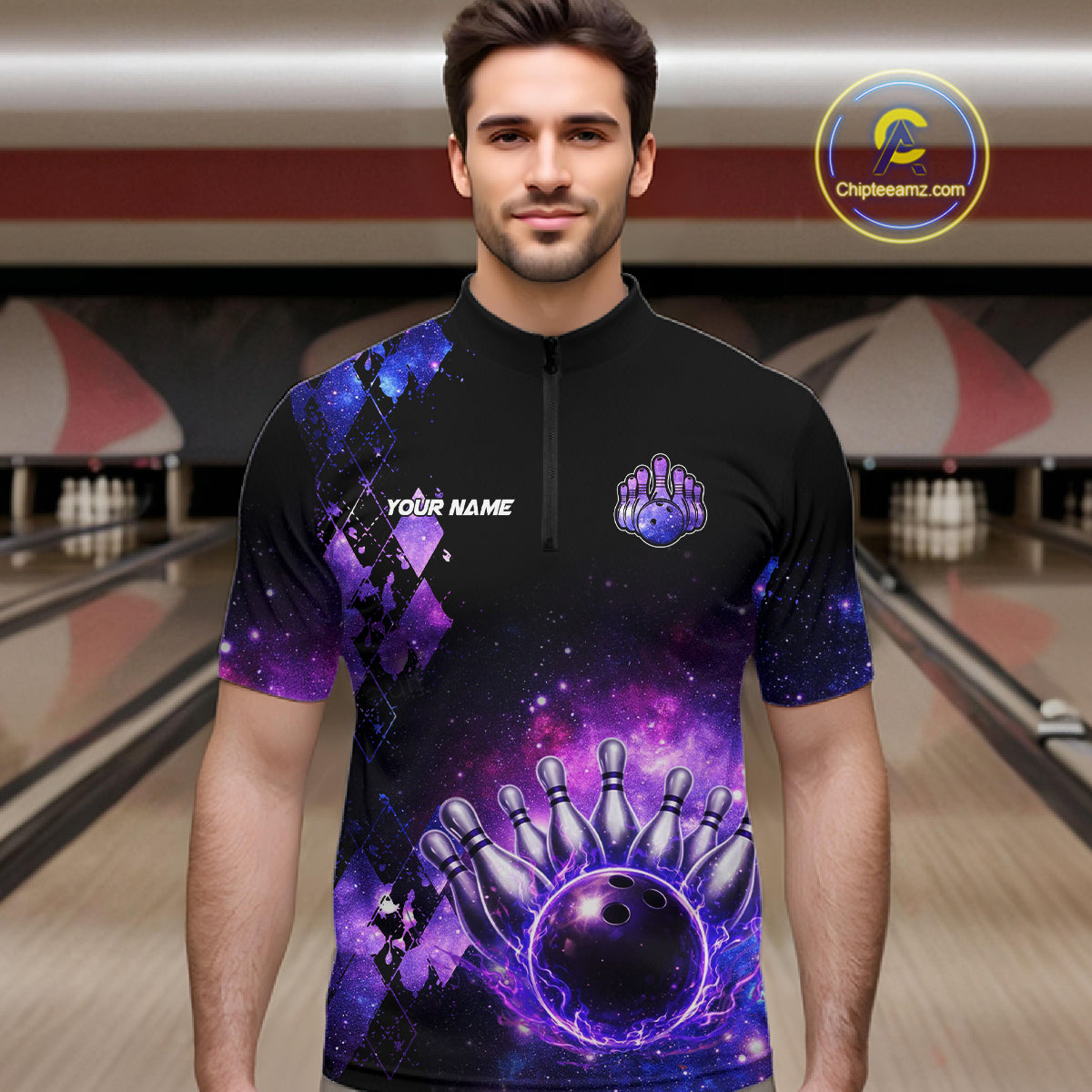 Purple Flame galaxy argyle Custom bowling polo shirts, 1/4 zip for men, team bowling league jerseys NQS11410