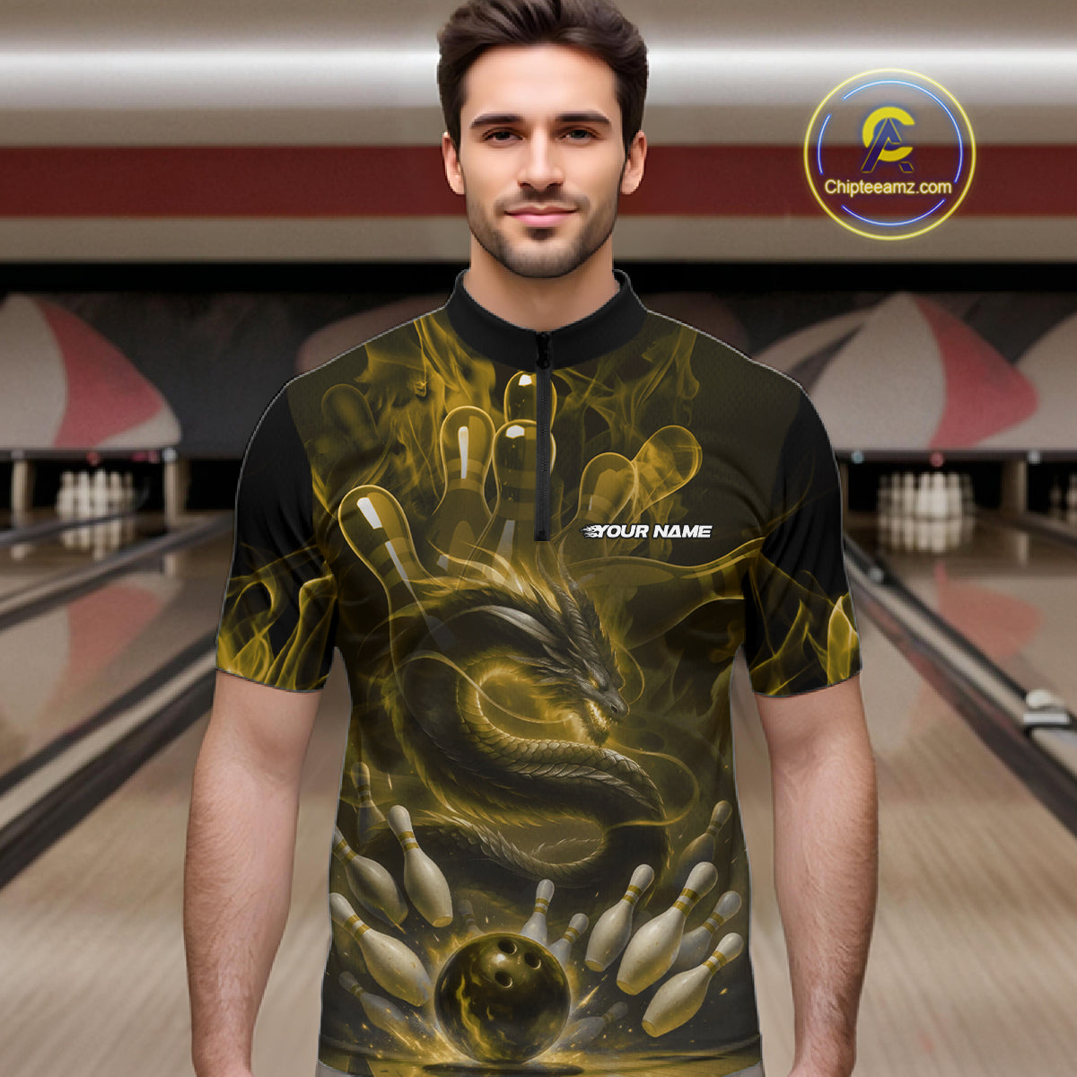 Custom Yellow Flame Dragon Bowling Men Quarter-Zip Shirts, Dragon Bowling League Shirt IPHW10225